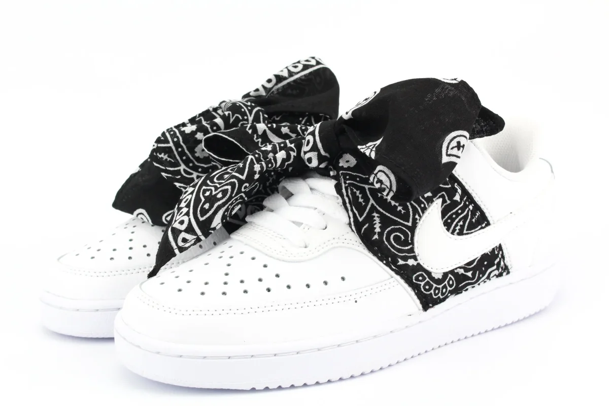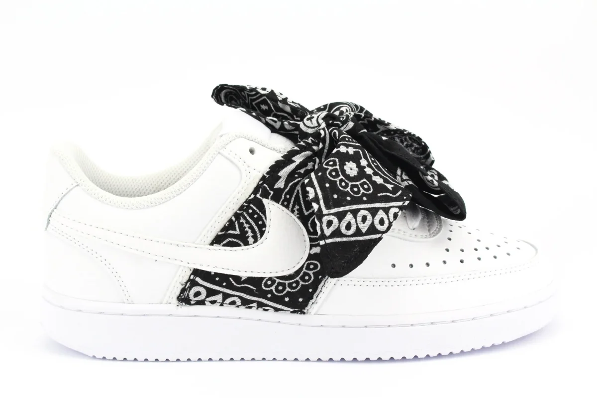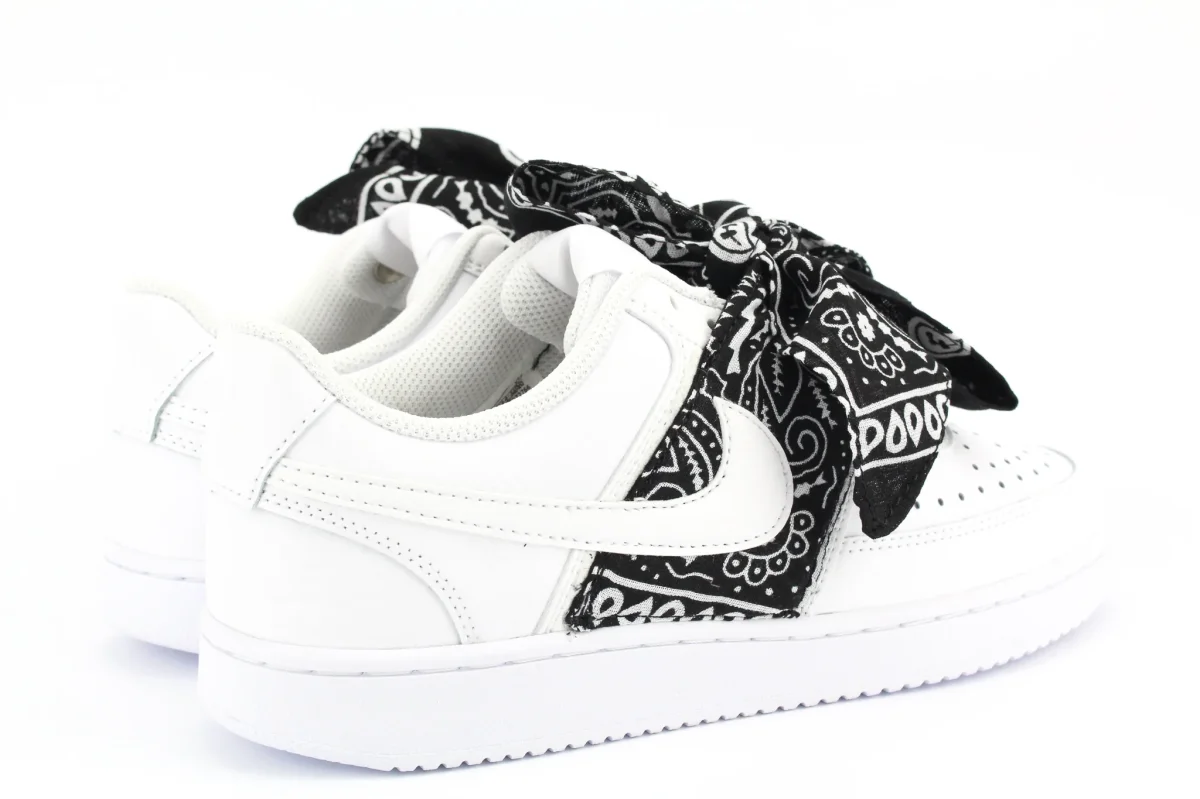 Scarpe originali Nike Court Vision Low personalizzate a mano con applicazione di bandana in stoffa colore nero che forma un fiocco regolabile sui lacci della sneakers. Ogni eventuale imperfezione è frutto del lavoro svolto artigianalmente.