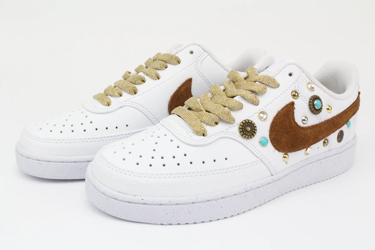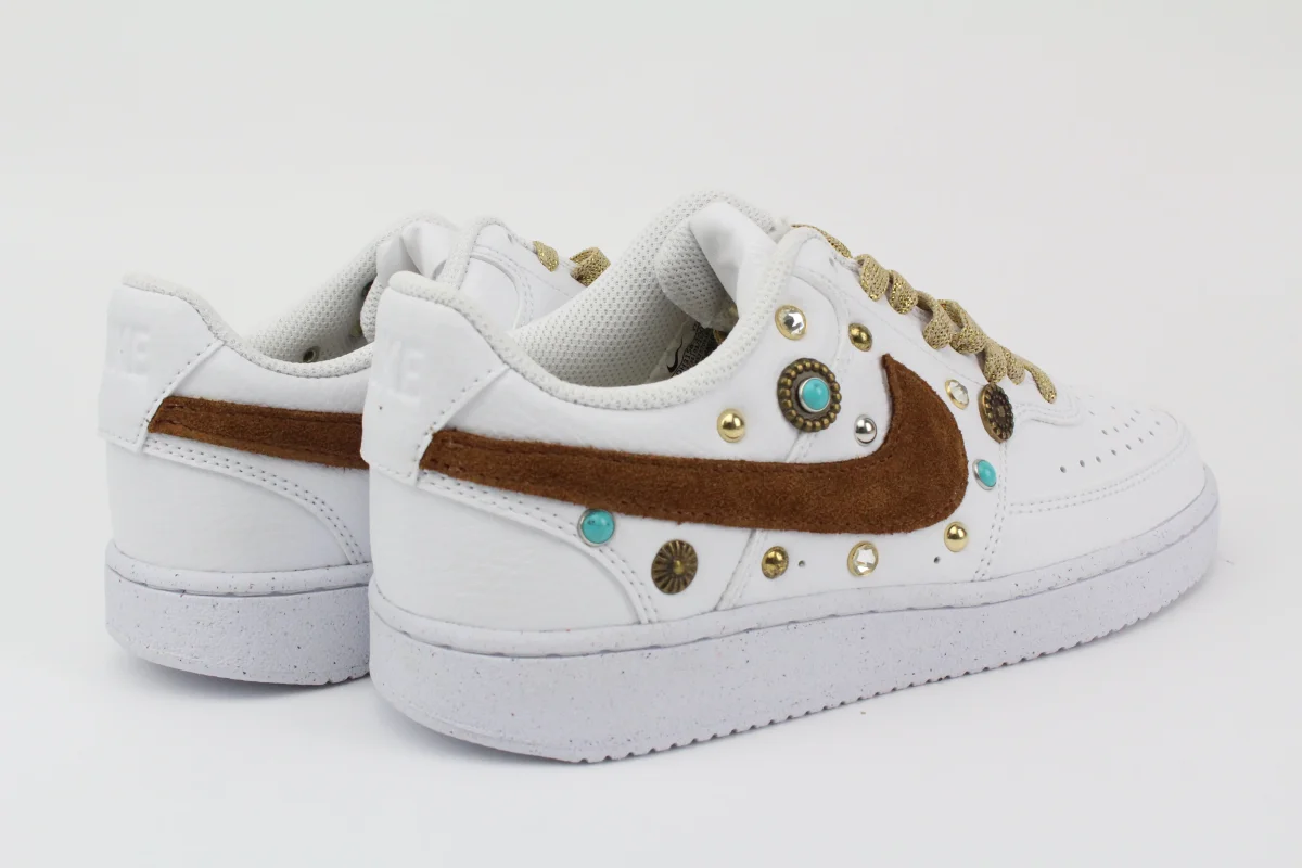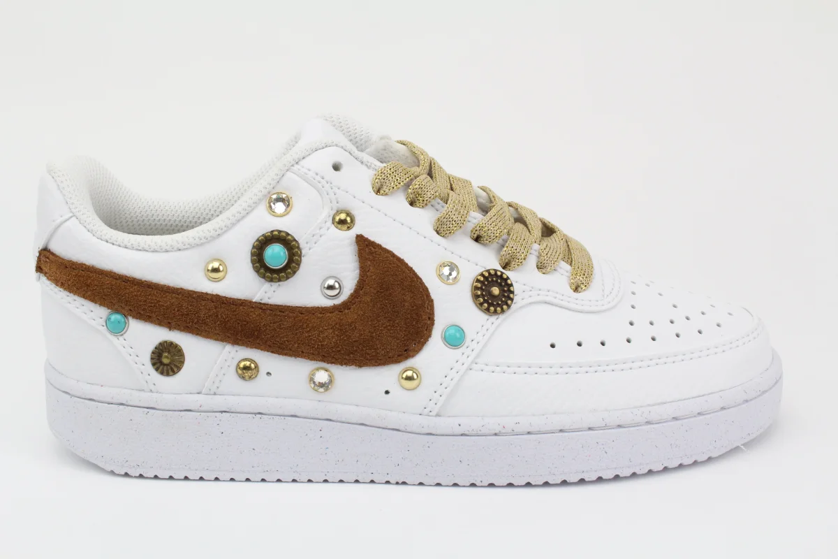Sneakers originali Nike Court Vision Low Personalizzate a mano con il celebre logo Nike rivestito in Camoscio color Tabacco e applicazione di borchie varie in ottone sulla parete laterale. Ogni imperfezione è frutto del lavoro svolto artigianalmente. Laccio originale bianco originale e laccio oro piatto