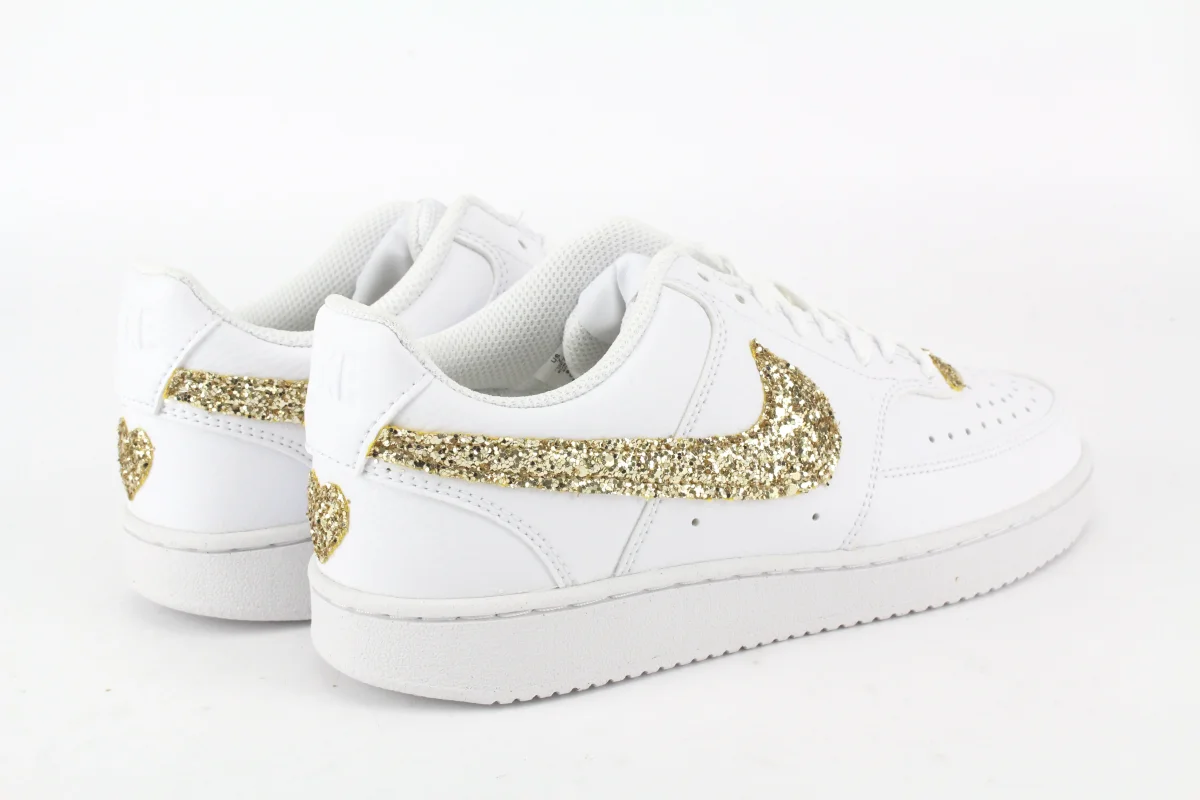 Scarpe originali Nike Court Vision Low personalizzate a mano con applicazione di Glitter Oro cucite sulla sneakers, applicazione di cuore oro sul tallone.