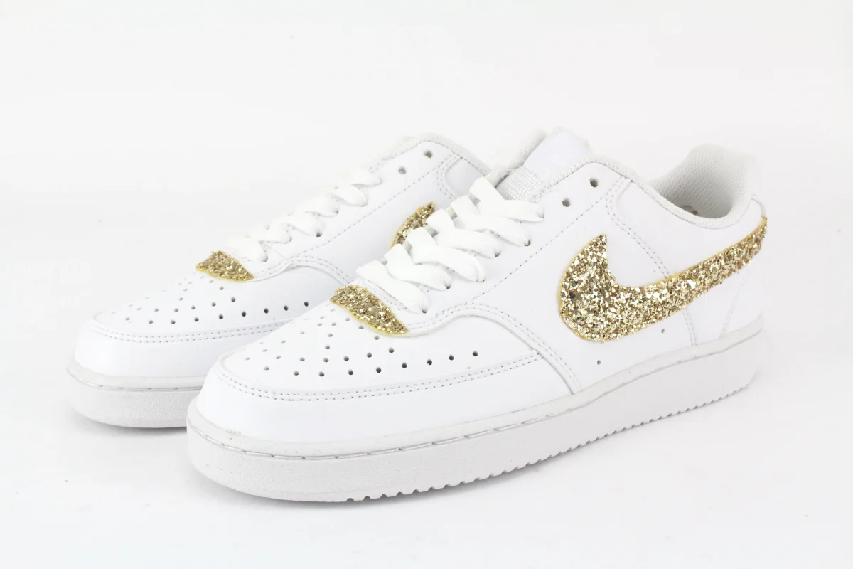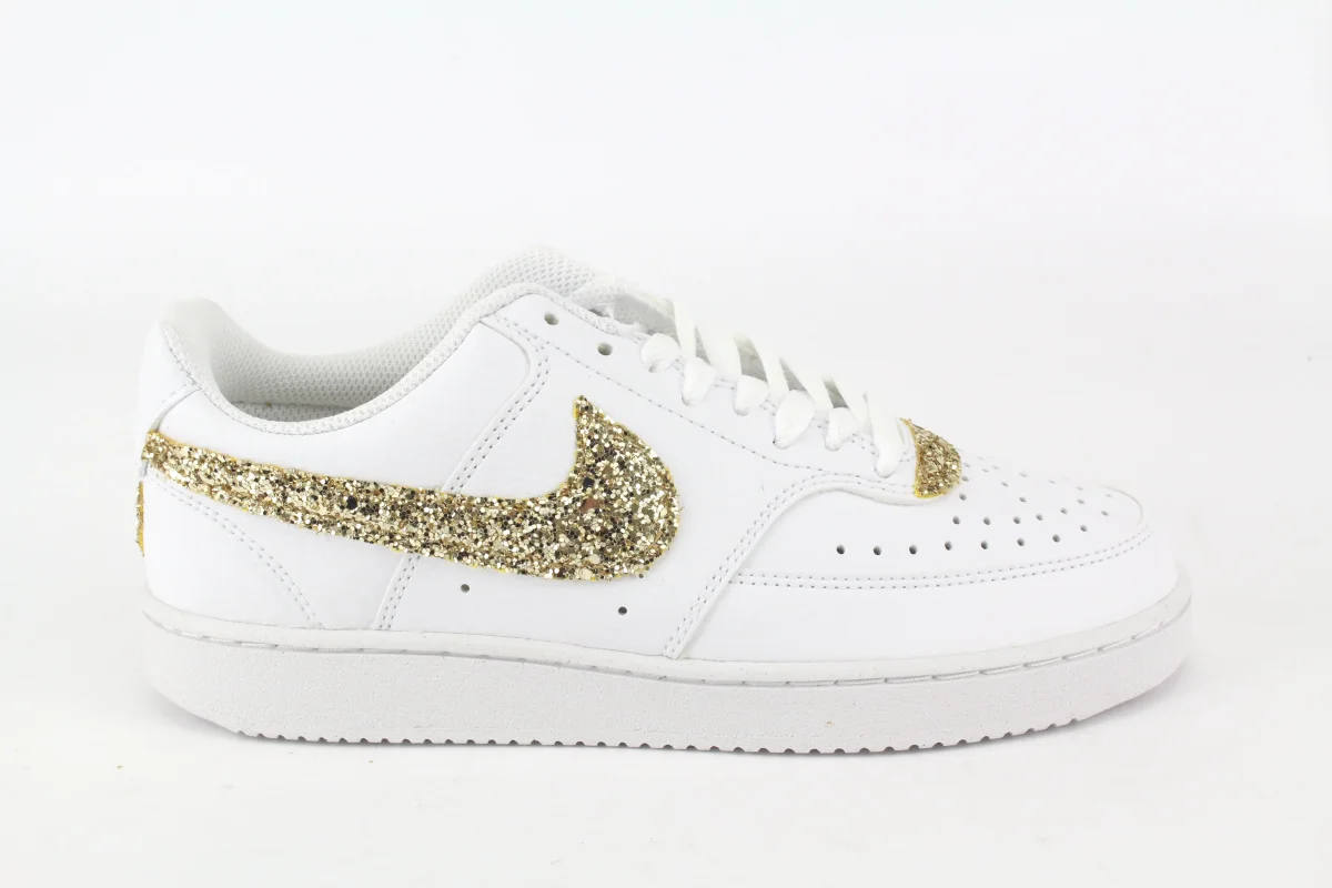 Scarpe originali Nike Court Vision Low personalizzate a mano con applicazione di Glitter Oro cucite sulla sneakers, applicazione di cuore oro sul tallone. Ogni eventuale imperfezione è frutto del lavoro svolto artigianalmente.