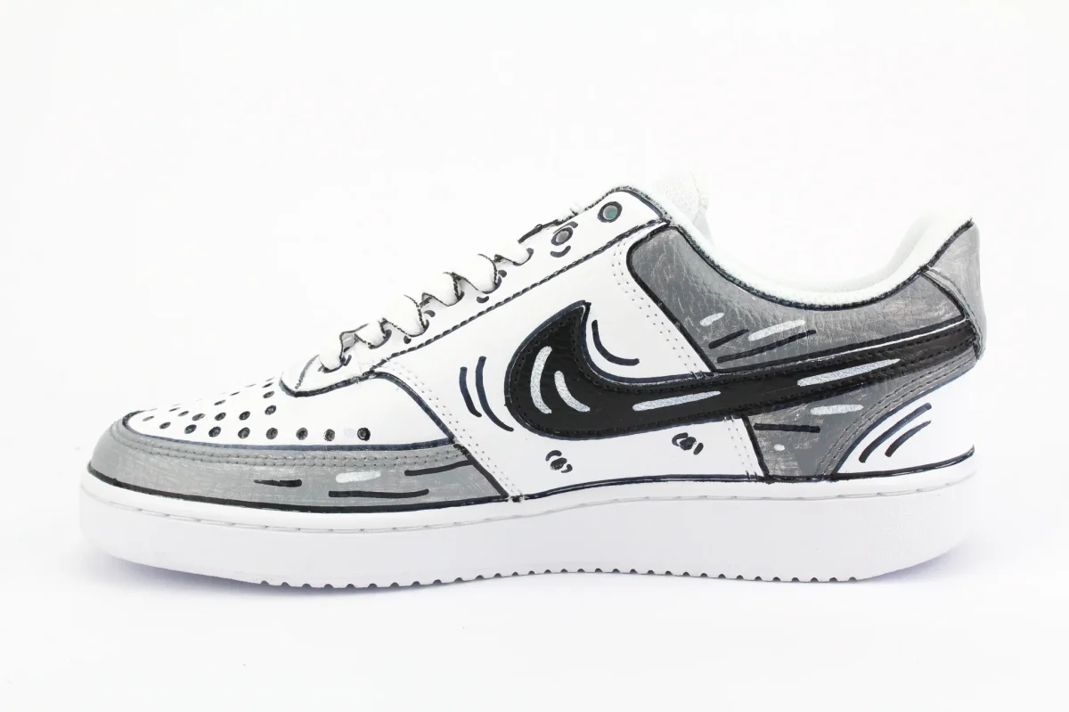 Scarpe originali Nike Court Vision Low personalizzate con graffiti neri e colorati dipinti a mano artigianalmente. Su ogni scarpa lavorata a mano viene eseguito un processo minuzioso che la rende un’opera unica, originale e resistente. Eventuali imperfezioni, pertanto, sono da considerarsi un valore aggiunto del lavoro artigianale. La qualità dei colori utilizzati uniti a specifici […]