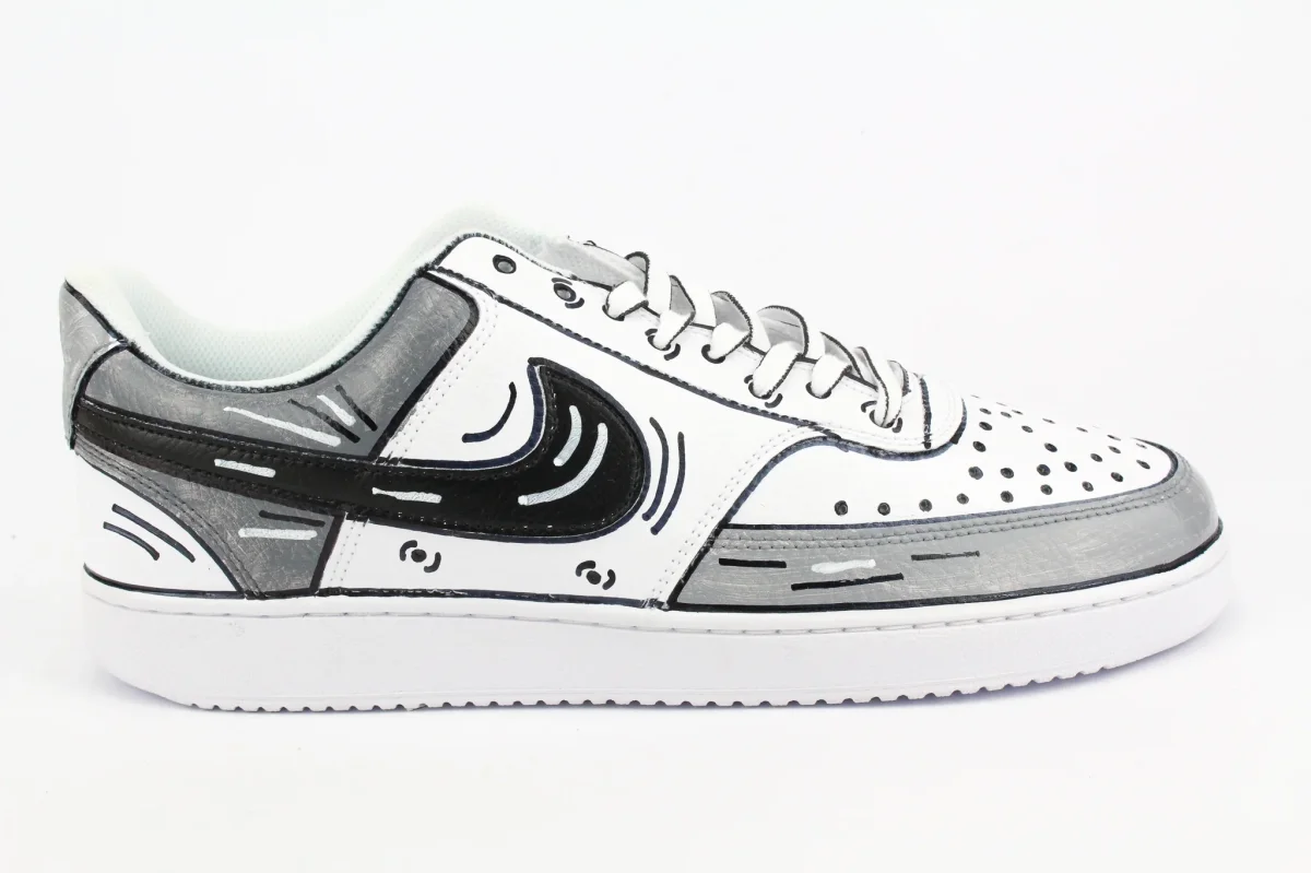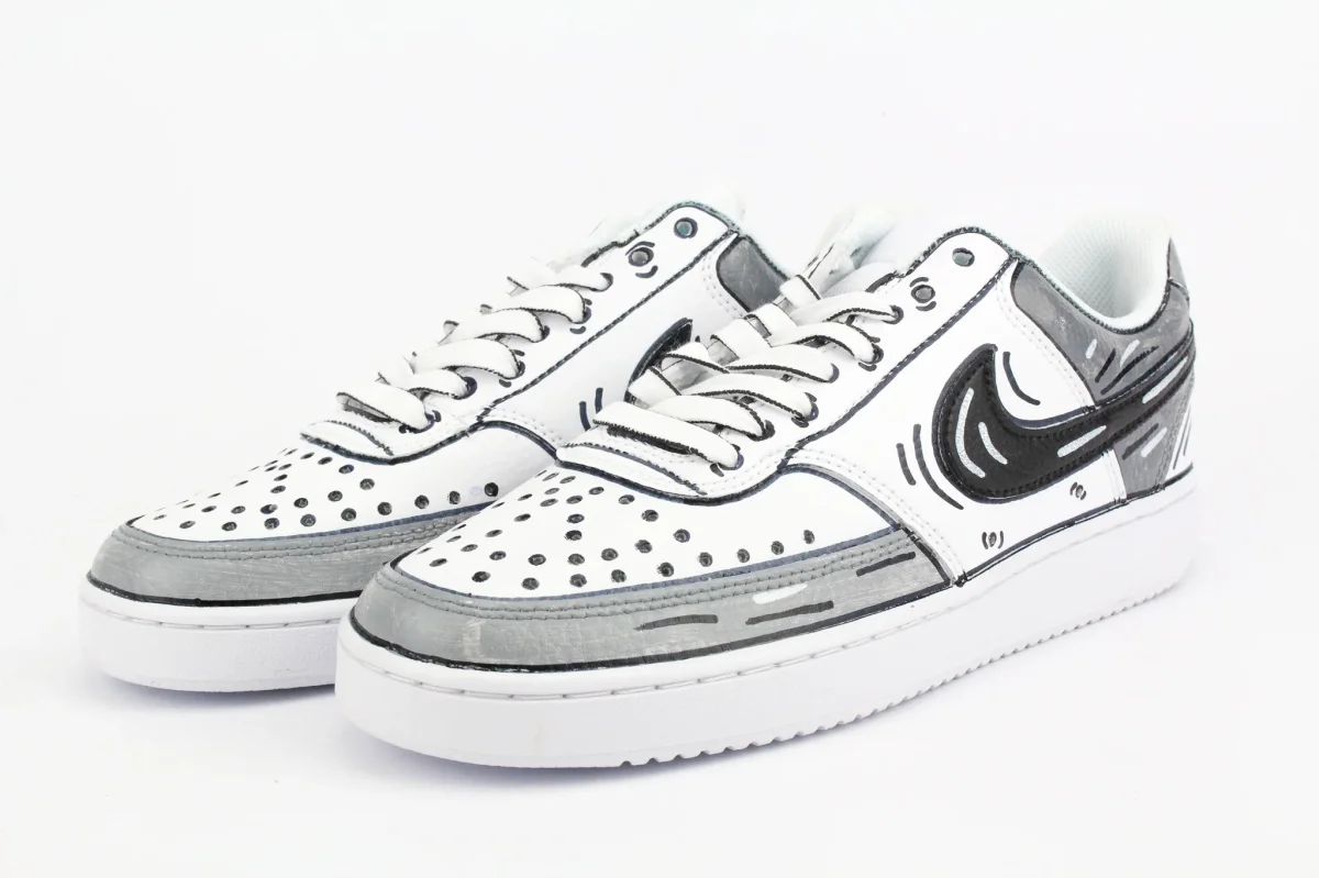 Scarpe originali Nike Court Vision Low personalizzate con graffiti neri e colorati dipinti a mano artigianalmente.