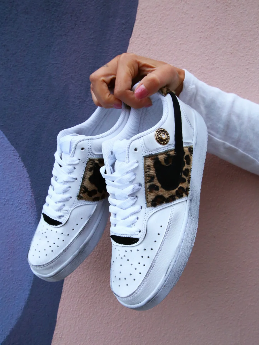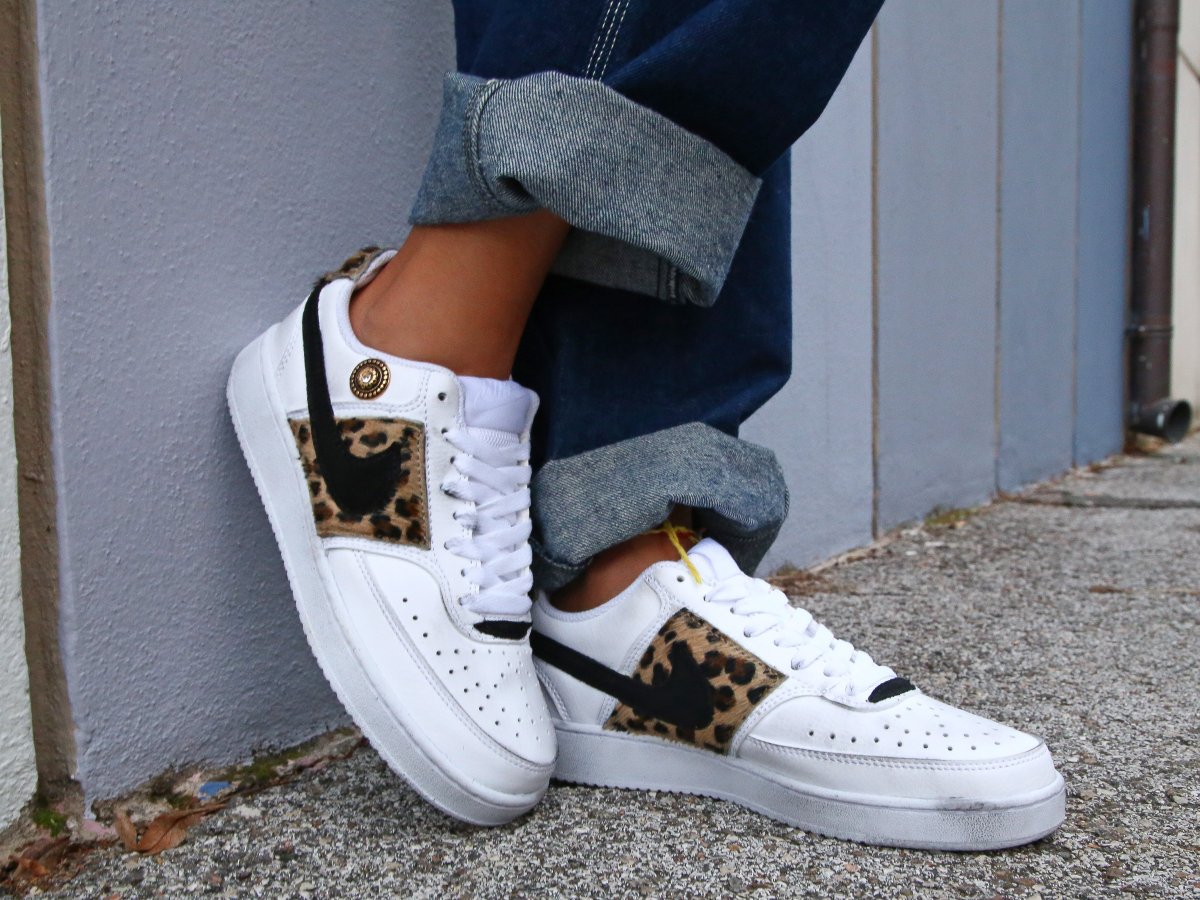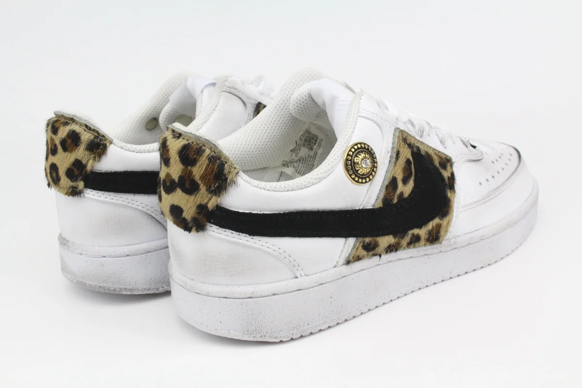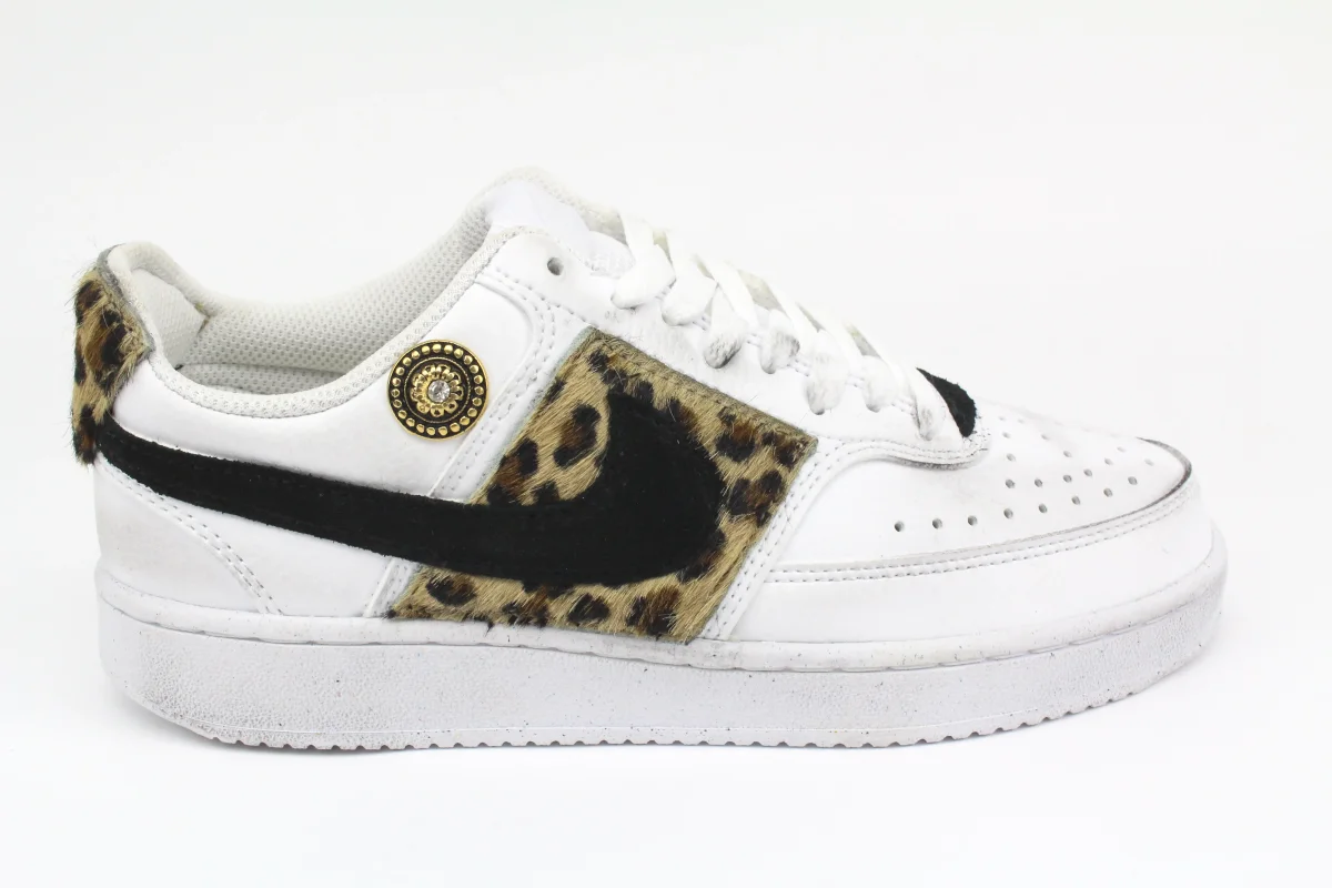 Sneakers originali Nike Court Vision Low personalizzate a mano con applicazione di Velluto nero sul baffo e cavallino maculato vero cucito sulla scarpa , applicata borchia in ottone sulla parete esterna.
