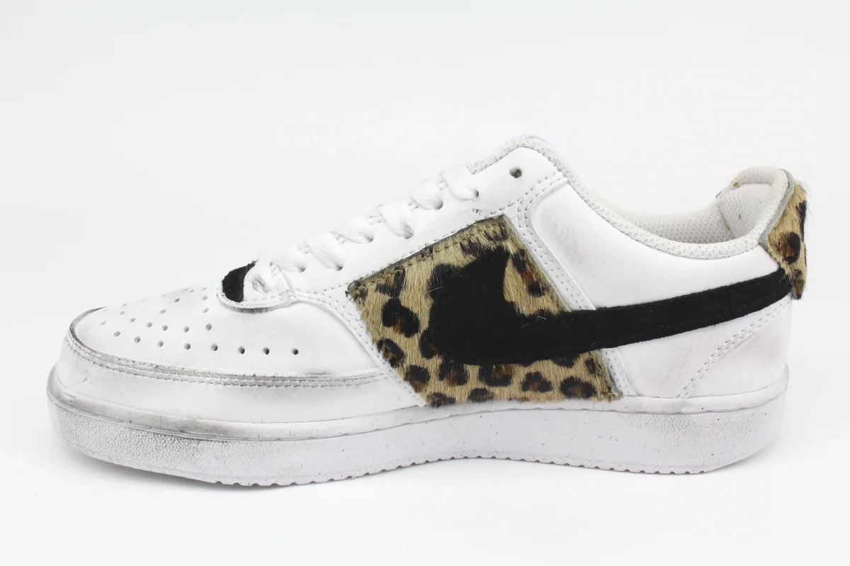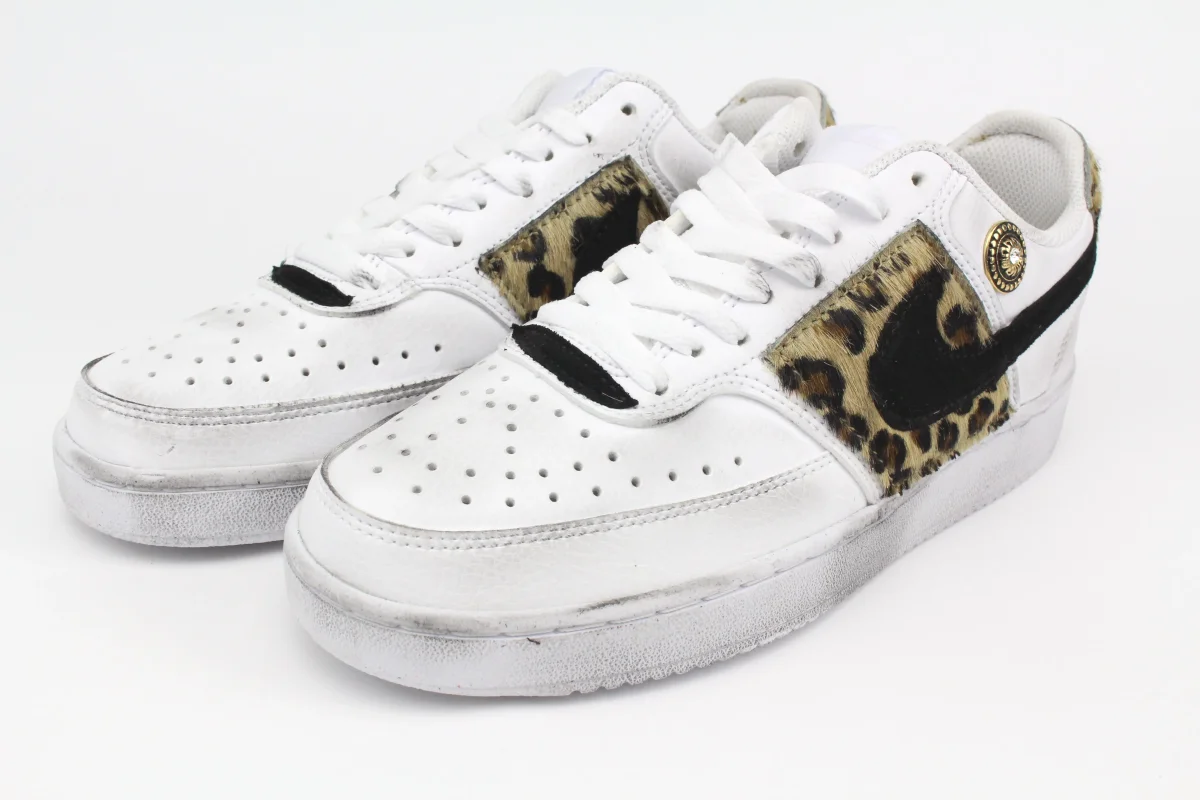 Sneakers originali Nike Court Vision Low personalizzate a mano con applicazione di Velluto nero sul baffo e cavallino maculato vero cucito sulla scarpa , applicata borchia in ottone sulla parete esterna. Ogni eventuale imperfezione è frutto del lavoro svolto artigianalmente. Leggera Sporcatura.