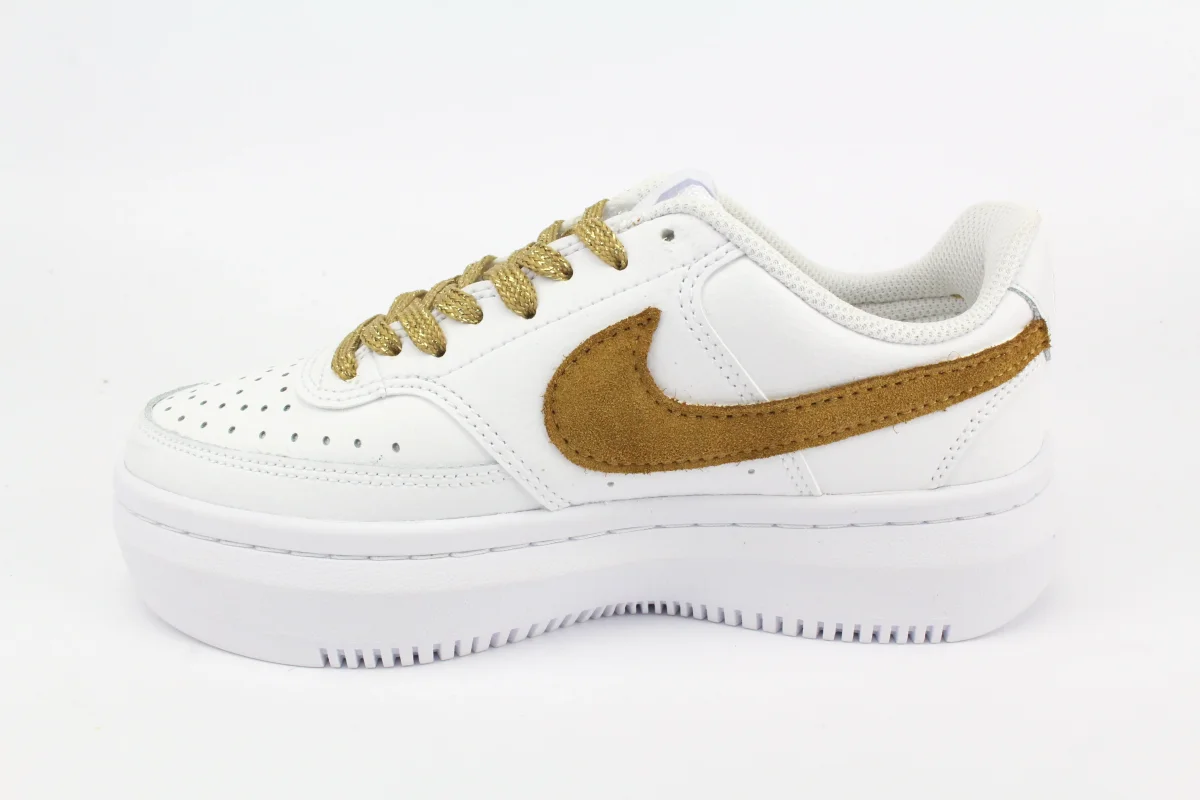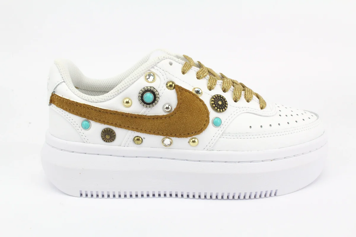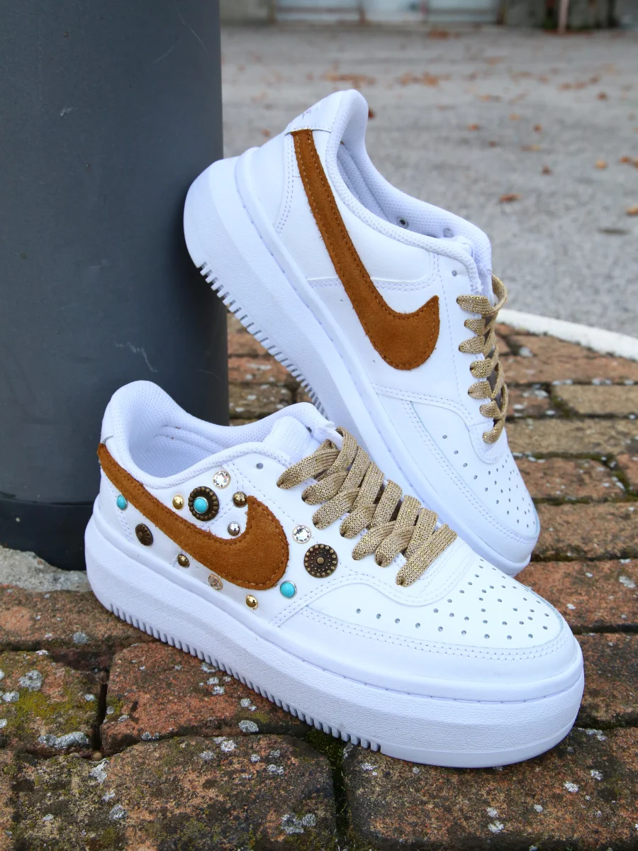 Sneakers originali Nike Court Vision Low Platform personalizzate a mano con il celebre logo Nike rivestito in Camoscio color Tabacco e applicazione di borchie varie in ottone sulla parete laterale. Ogni imperfezione è frutto del lavoro svolto artigianalmente. Laccio originale bianco originale e laccio oro piatto