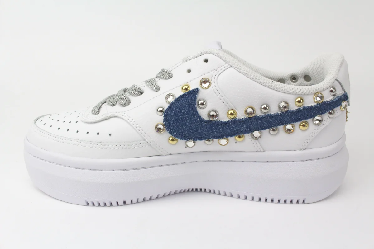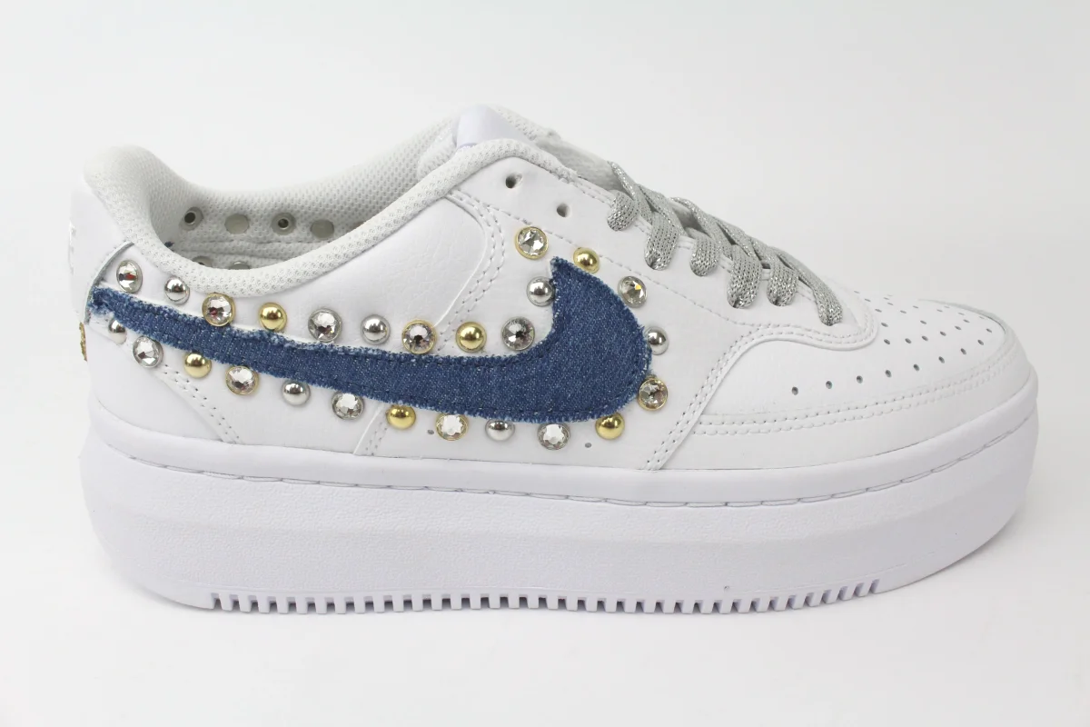 Sneakers originali Nike Court Vision Low Platform personalizzate a mano con il celebre logo Nike rivestito in Jeans e applicazione di borchie oro/argento e strass sulle pareti laterali. Cuore oro e cuore argento sul retro.