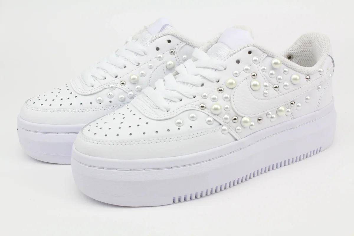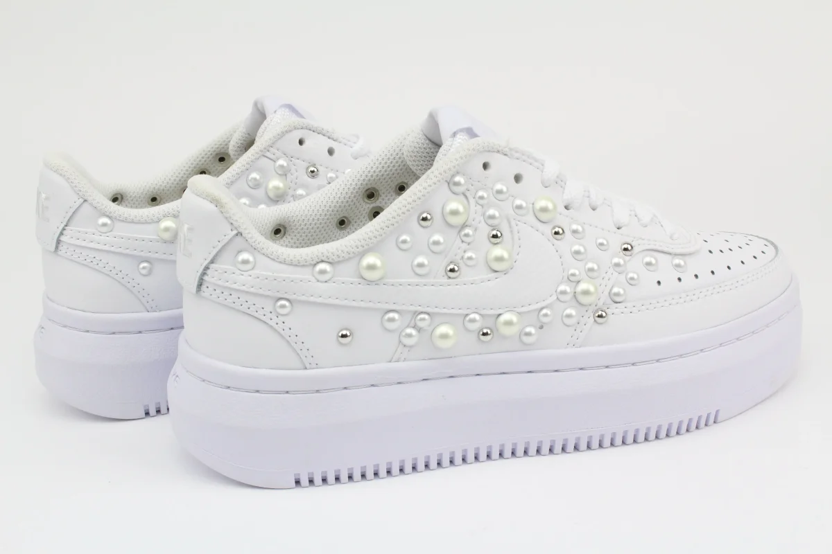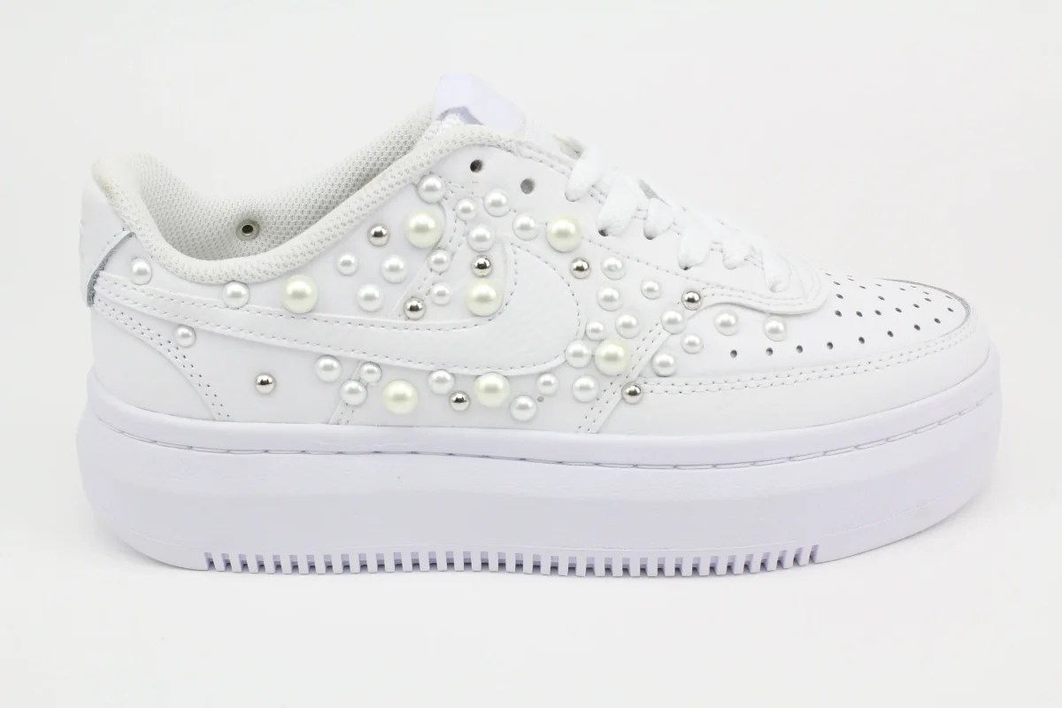Sneakers originali Nike Court Vision Low Platform personalizzate con applicazione esterna di Perle di varia misura e Borchie argento. Su ogni scarpa lavorata a mano viene eseguito un processo minuzioso che la rende un’opera unica, originale e resistente. Eventuali imperfezioni, pertanto, sono da considerarsi un valore aggiunto del lavoro artigianale. Laccio originale Nike bianco