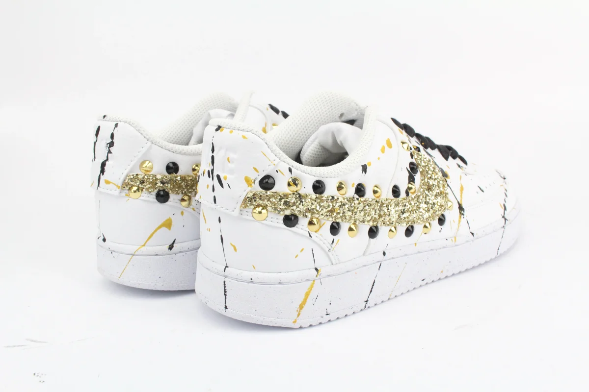 Scarpe originali Nike Court Vision Low personalizzate con Glitter oro nel baffo Nike, mix di Borchie nere e oro e skizzi abbinati.