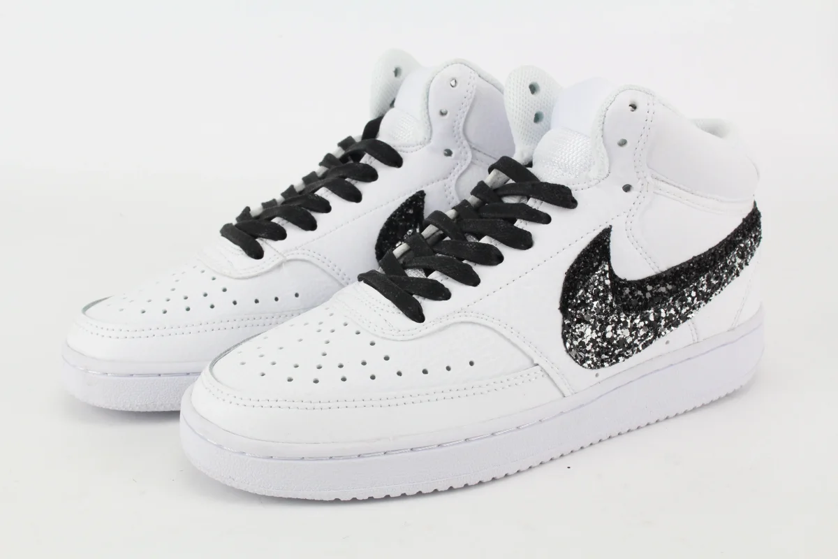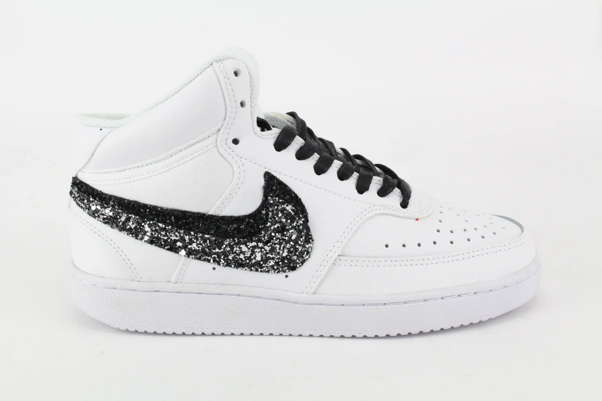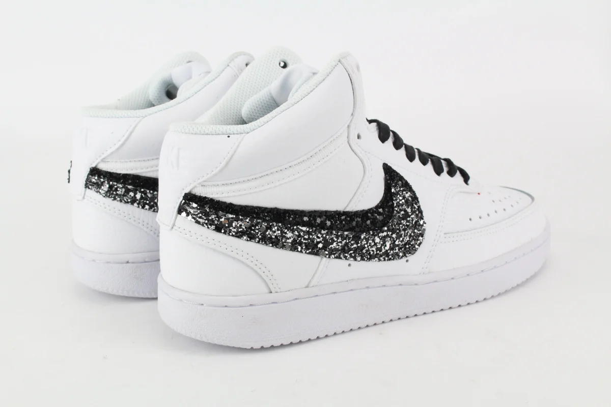 Scarpe originali Nike Court Vision MID personalizzate con doppio baffo nero glitter e Glitter Black Silver