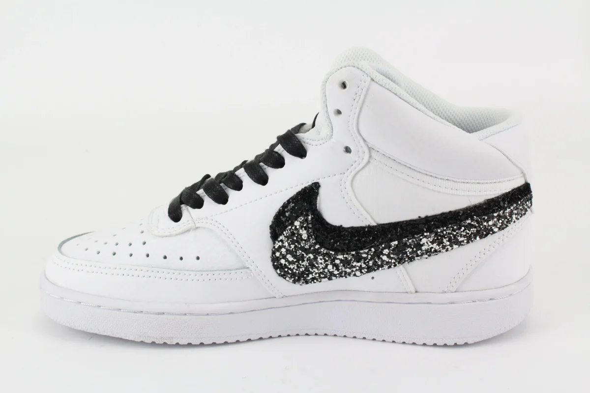 Scarpe originali Nike Court Vision MID personalizzate con doppio baffo nero glitter e Glitter Black Silver Su ogni scarpa lavorata a mano viene eseguito un processo minuzioso che la rende un’opera unica, originale e resistente. Eventuali imperfezioni, pertanto, sono da considerarsi un valore aggiunto del lavoro artigianale. Laccio Nero compreso e laccio originale Nike bianco