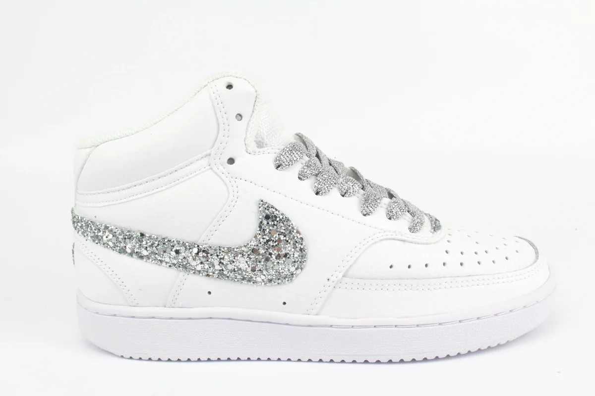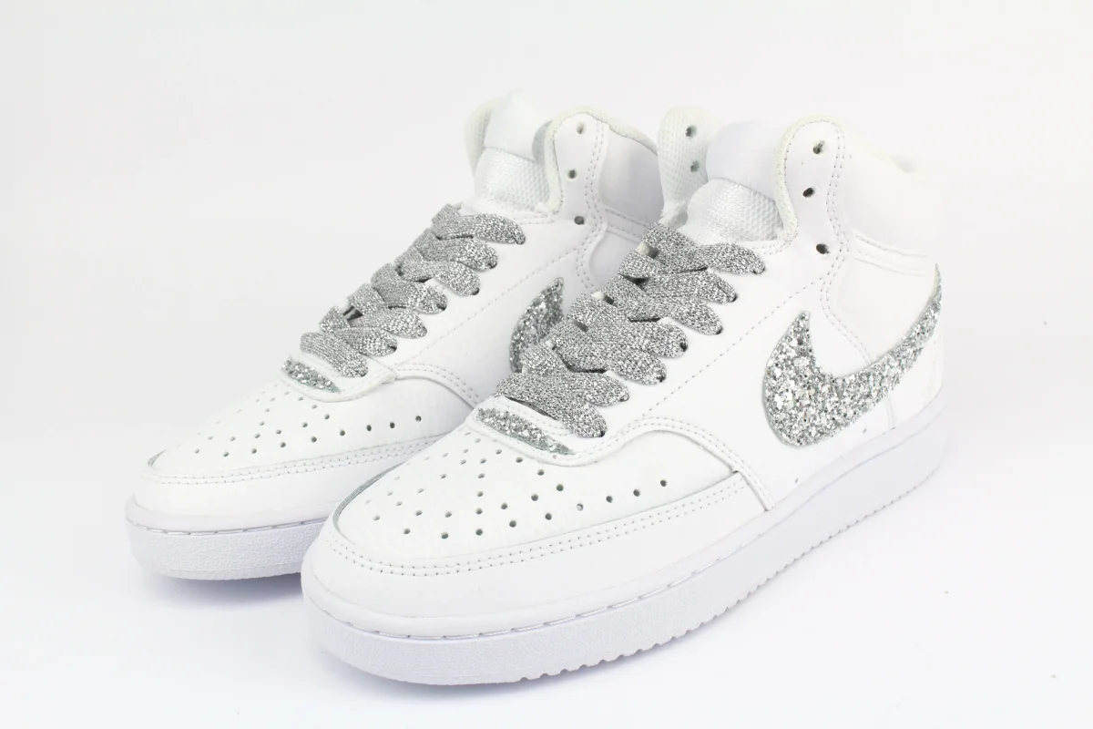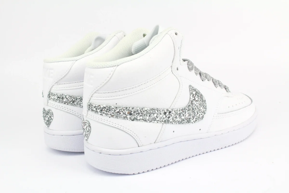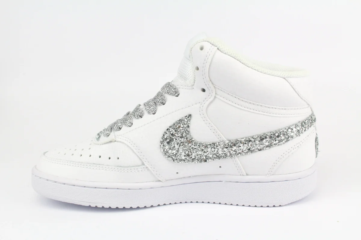 Scarpe originali Nike Court Vision MID personalizzate con baffo Glitter Silver.
