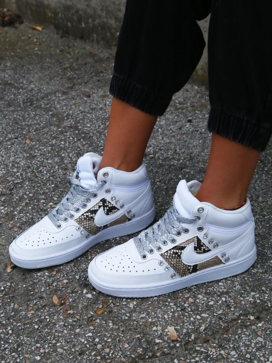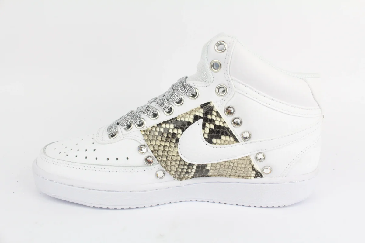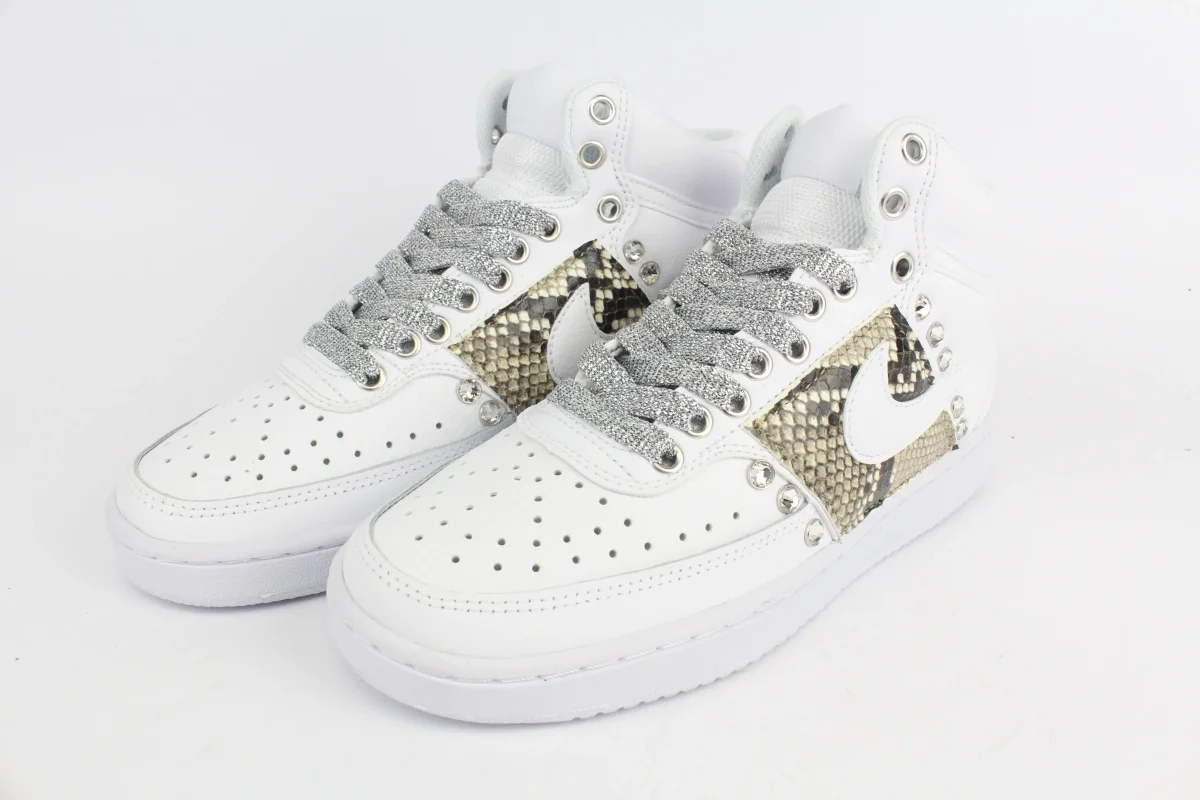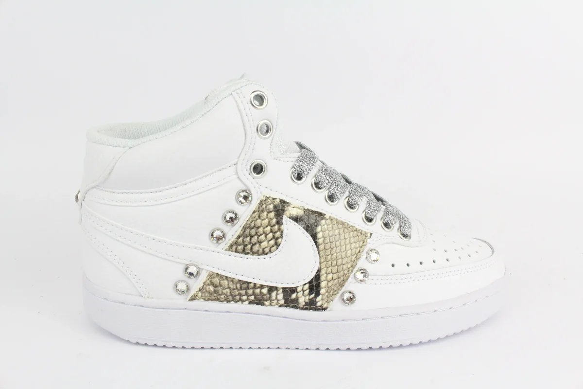 Scarpe originali Nike Court Vision MID personalizzate con applicazione di Pitone Roccia intorno al Baffo Nike , Strass a base Argento e Vele Argento inoltre Applicazione di uno Strass grande sul tallone .