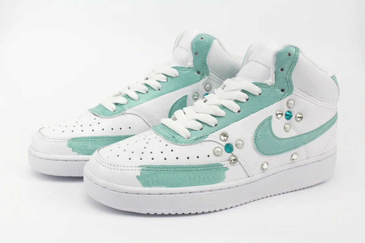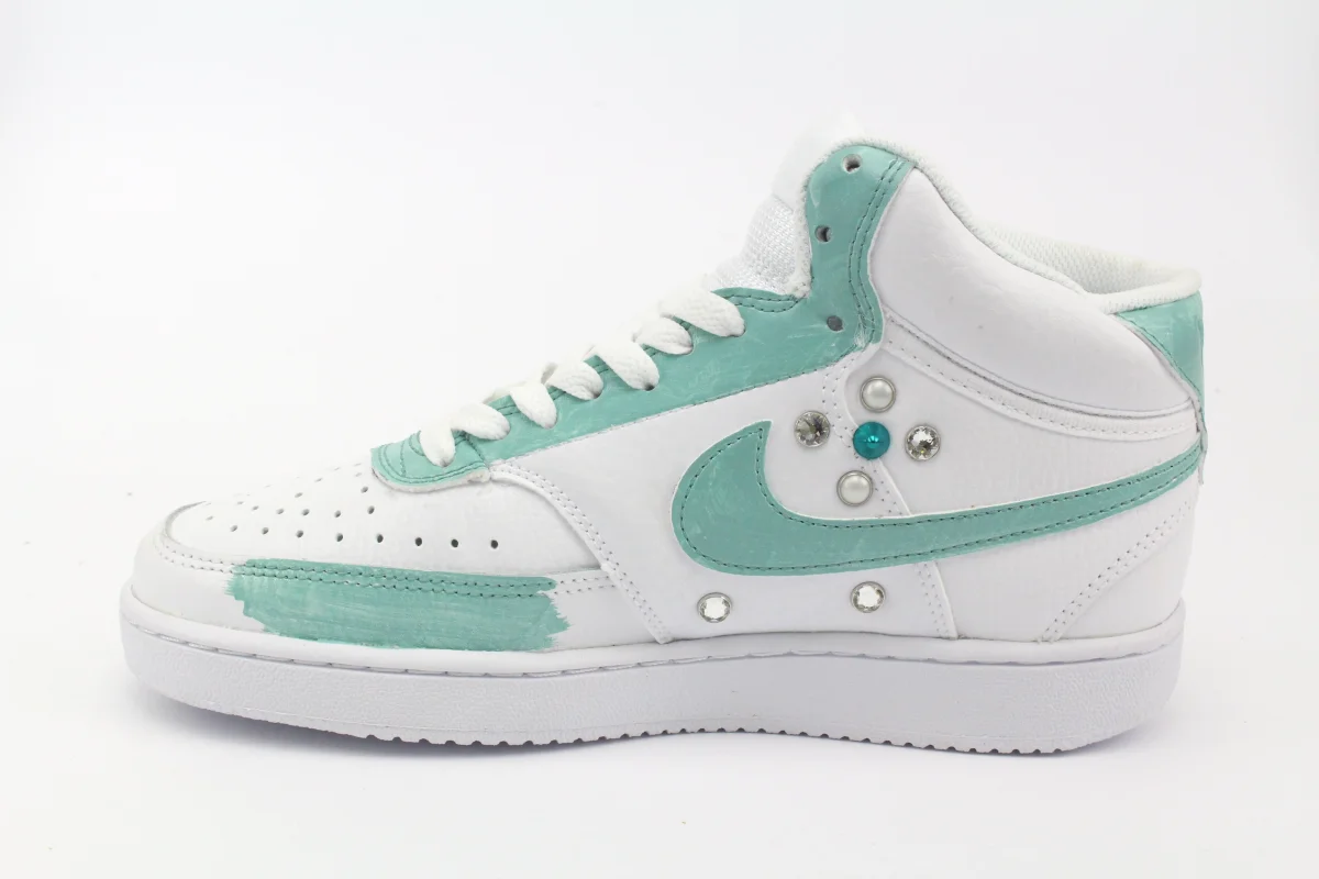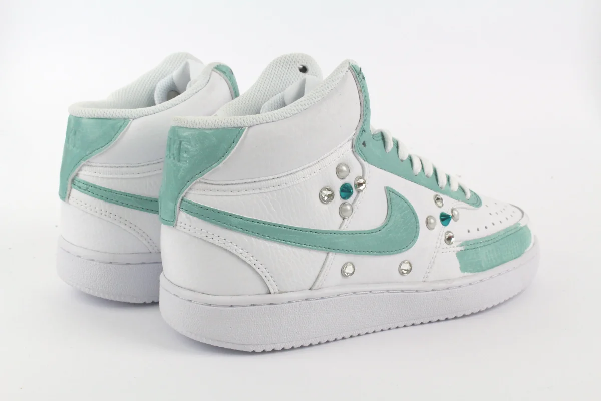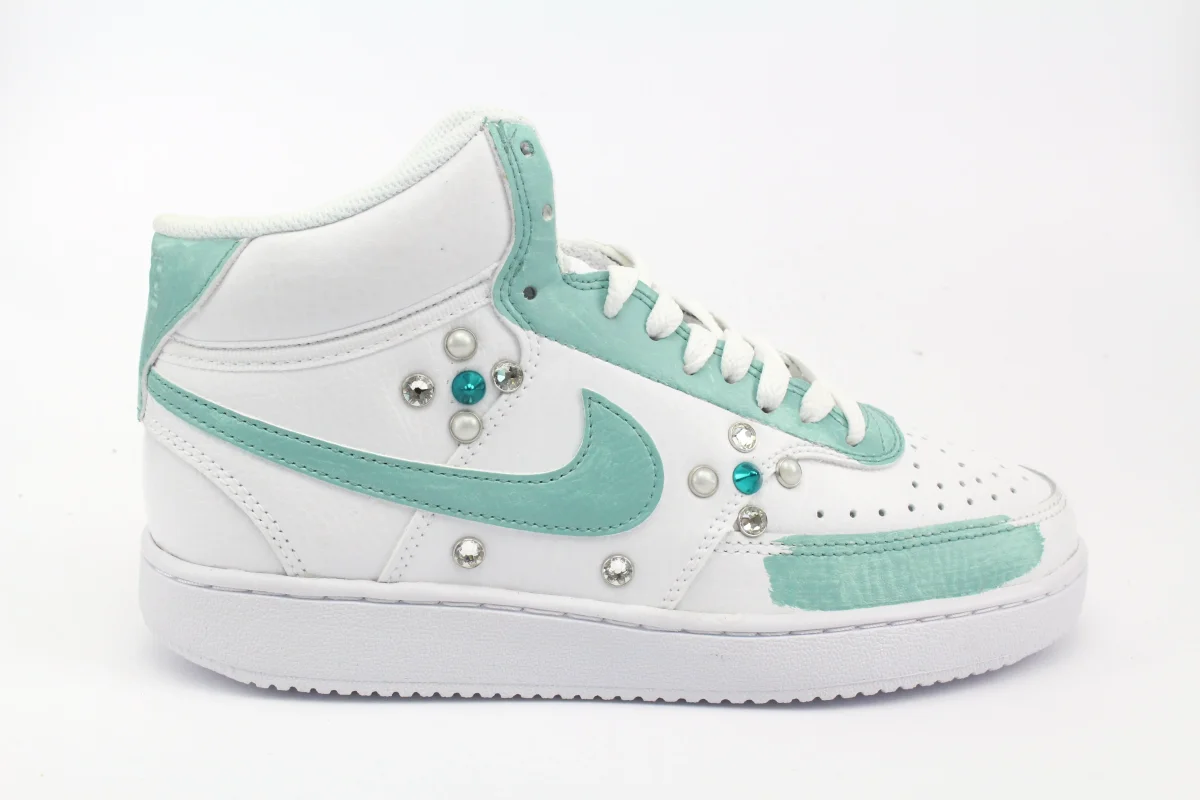 Scarpe originali Nike Court Vision MID personalizzate con pennellate di vernice colorata Tiffany , impreziosita da Strass Swarowsky , Borchie e Perle.