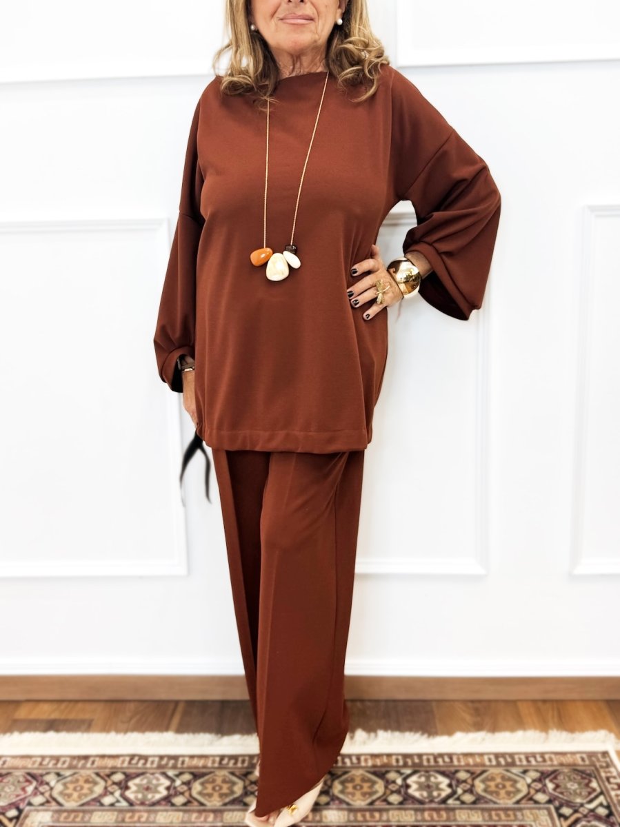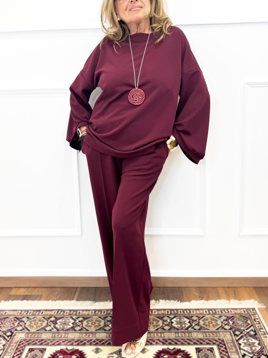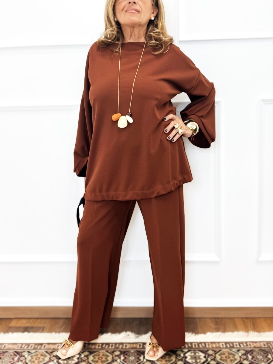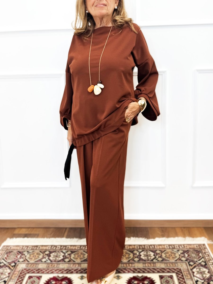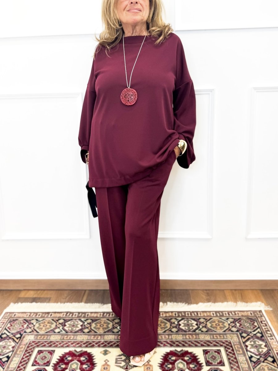 Pantalone a palazzo in crepe di viscosa ed elastico in vita. È realizzato interamente a mano dal nostro laboratorio sartoria. È realizzabile fino ad un giro fianco di 125 cm.
