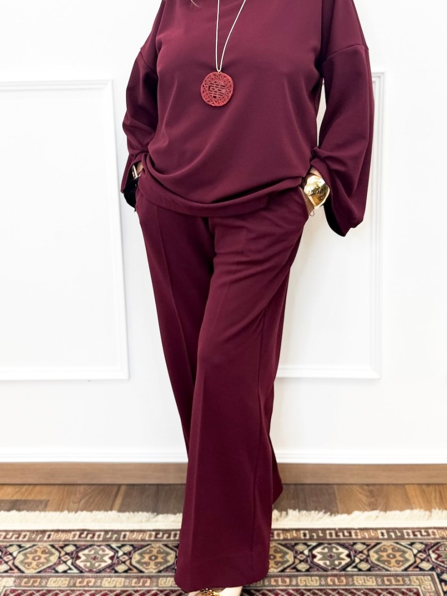 Pantalone a palazzo in crepe di viscosa ed elastico in vita. È realizzato interamente a mano dal nostro laboratorio sartoria.