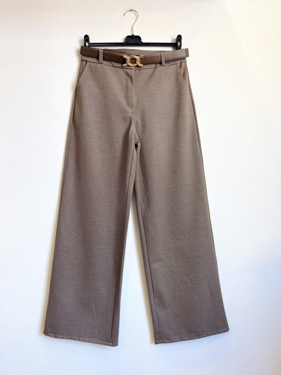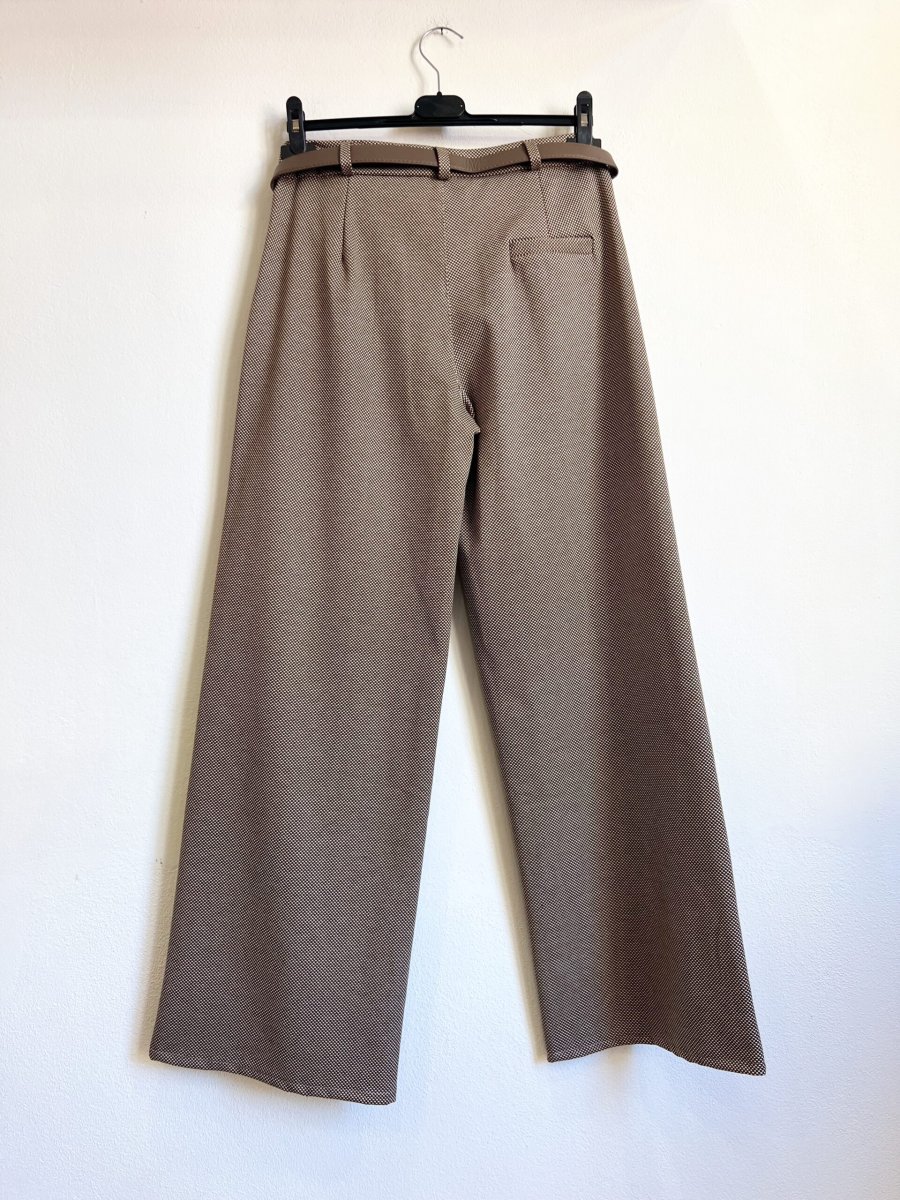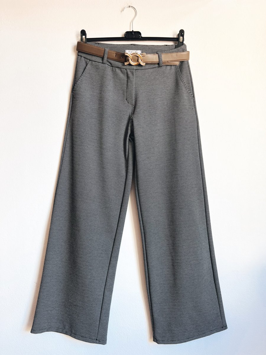 Pantalone con gamba morbida e chiusura tramite bottoni e cerniera. Ha due tasche laterali e una finta tasca sul retro. É corredato di cintura. Ha un vestibilità ridotta.