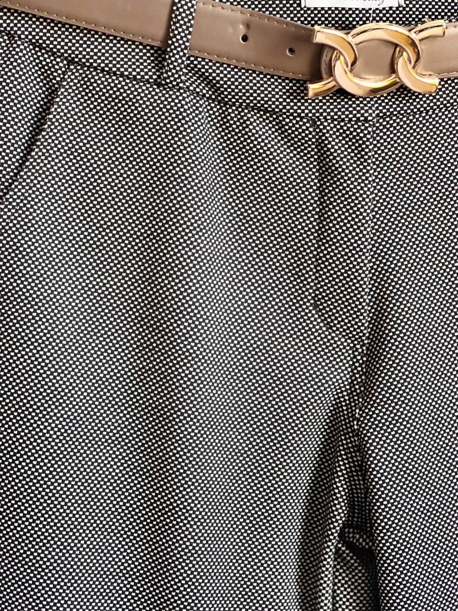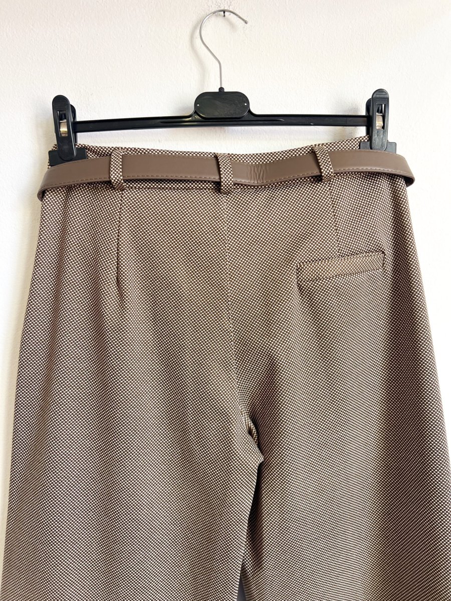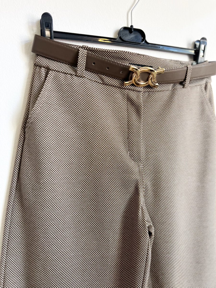 Pantalone con gamba morbida e chiusura tramite bottoni e cerniera. Ha due tasche laterali e una finta tasca sul retro. É corredato di cintura. Ha un vestibilità ridotta.