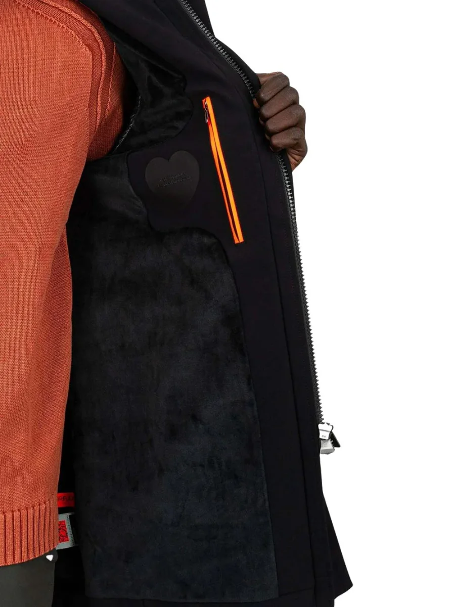 – Interno foderato in pregiato velluto con taschino a zip invisibile e dettagli arancioni fluo.