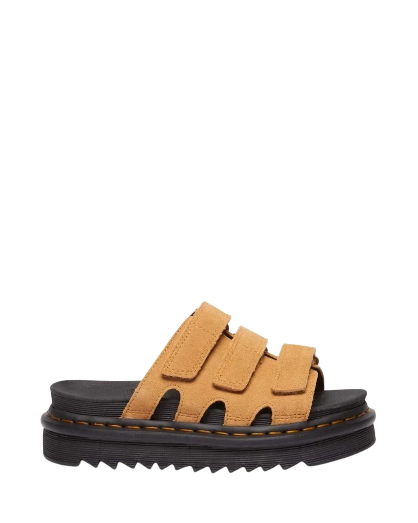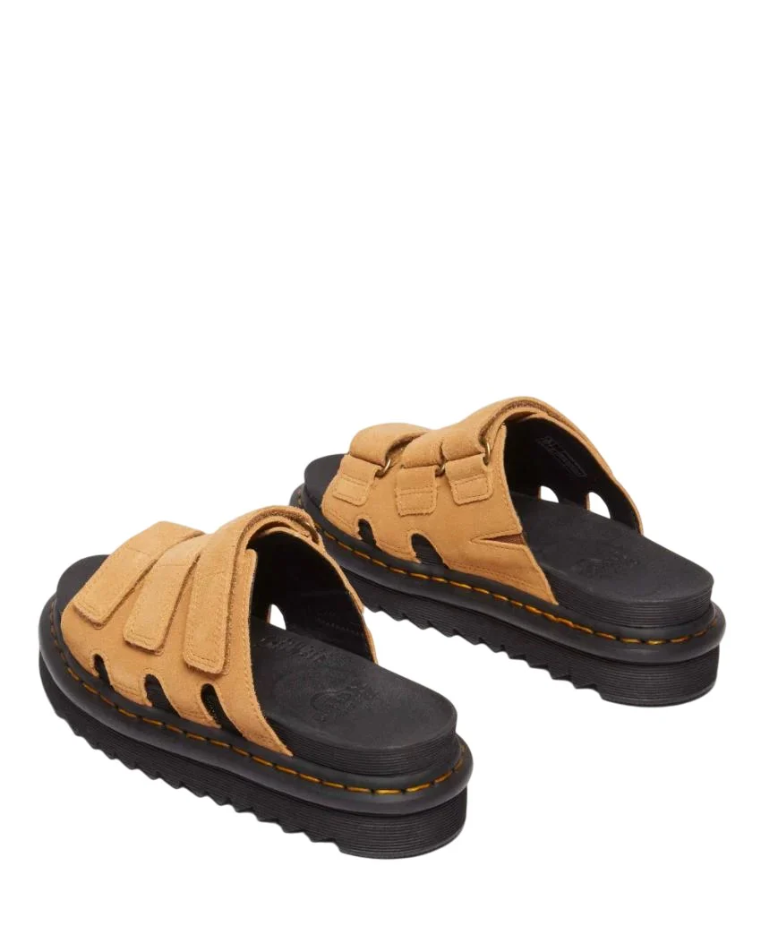 Sandali DR. MARTENS con tre cinturini regolabili in velcro e una finitura in pelle opaca lucida. Costruite sulla suola ultraleggera Zebrilus.
