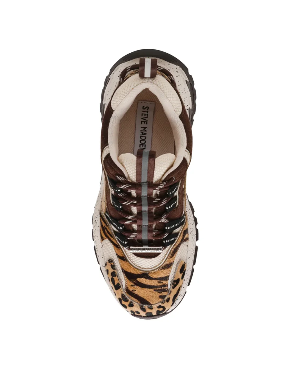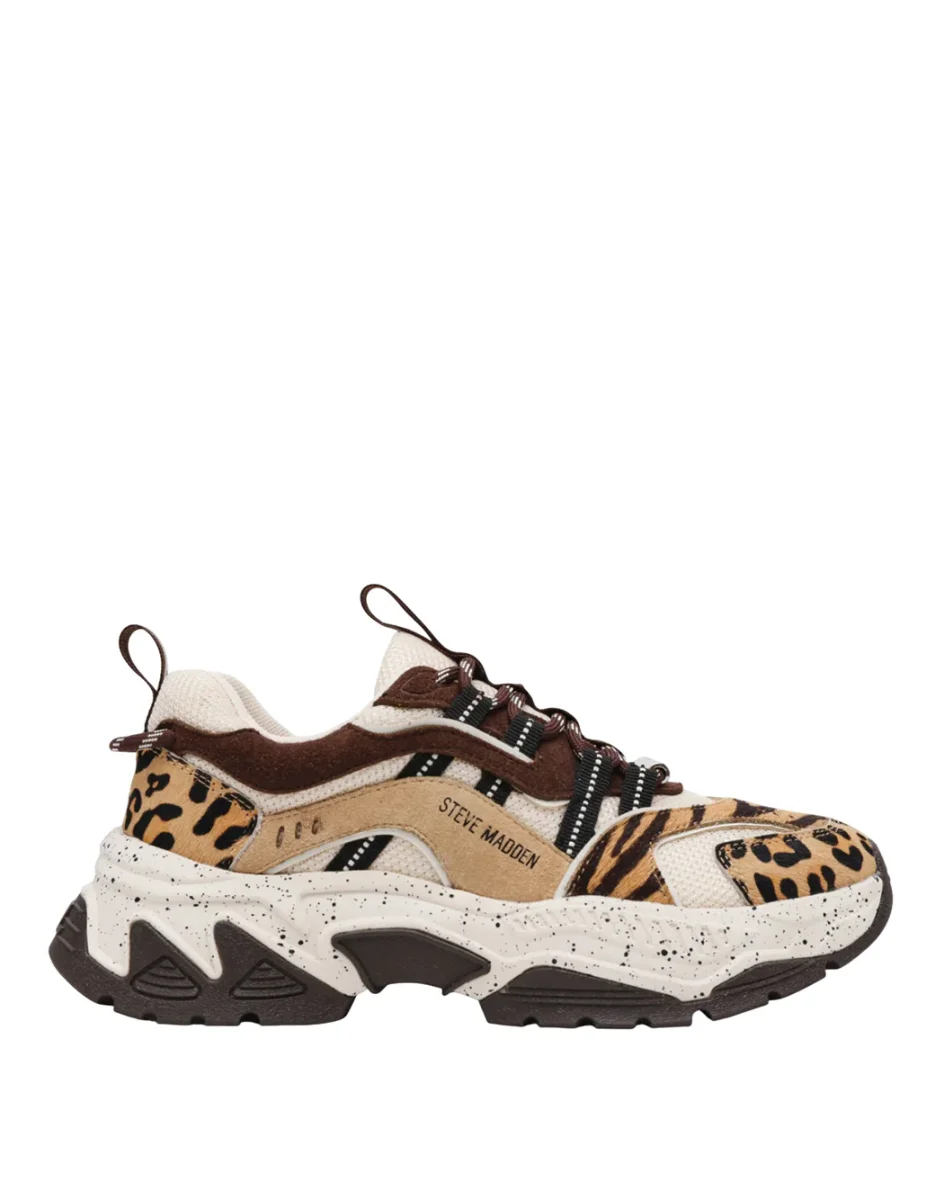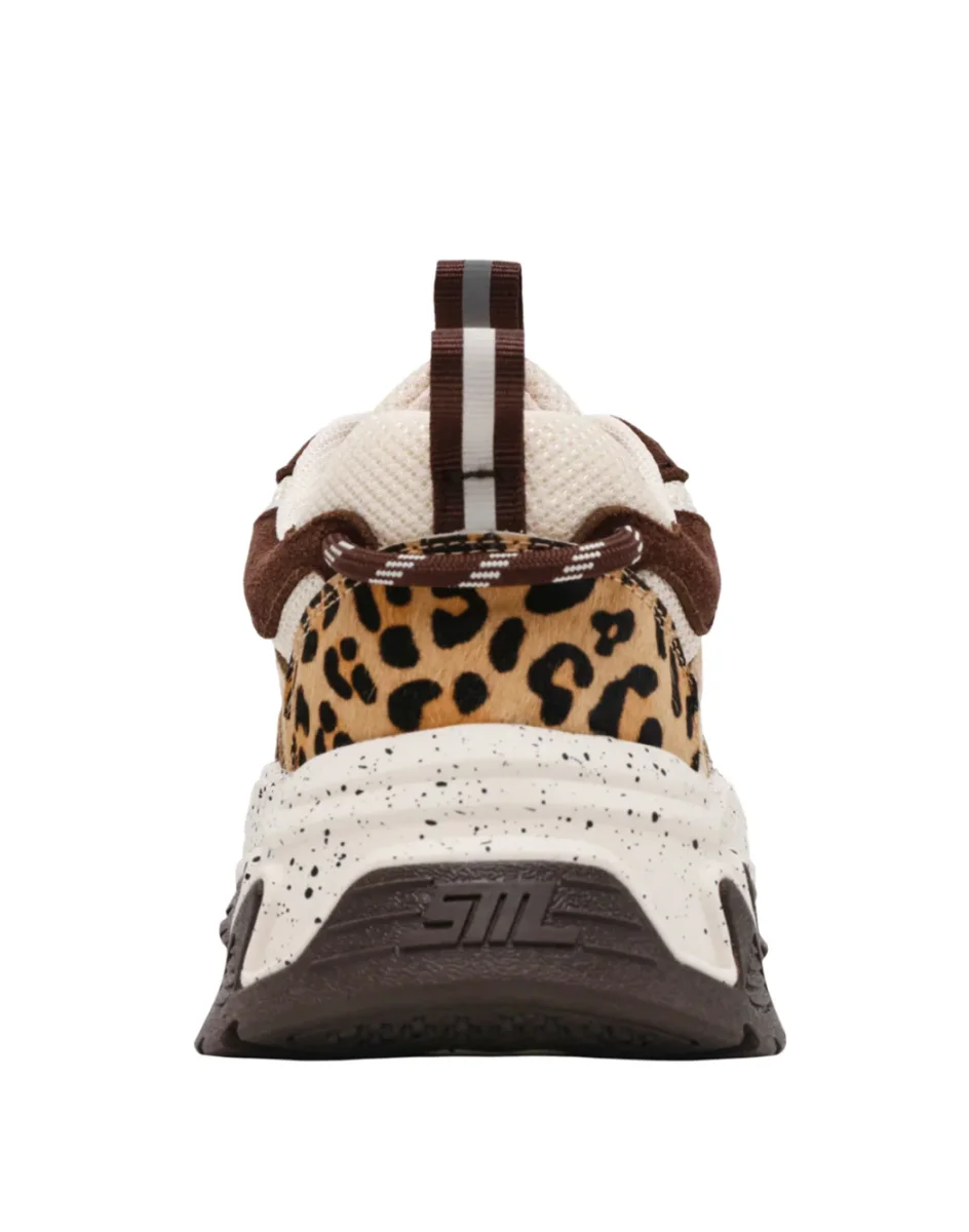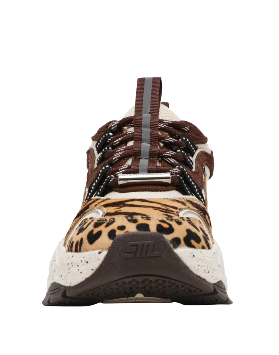Sneaker platform in stampa leopardata con dettagli in suede e tessuto. Tomaia multistrato, chiusura con lacci e suola in gomma. Comoda, trendy e perfetta per dare grinta ai tuoi look casual.