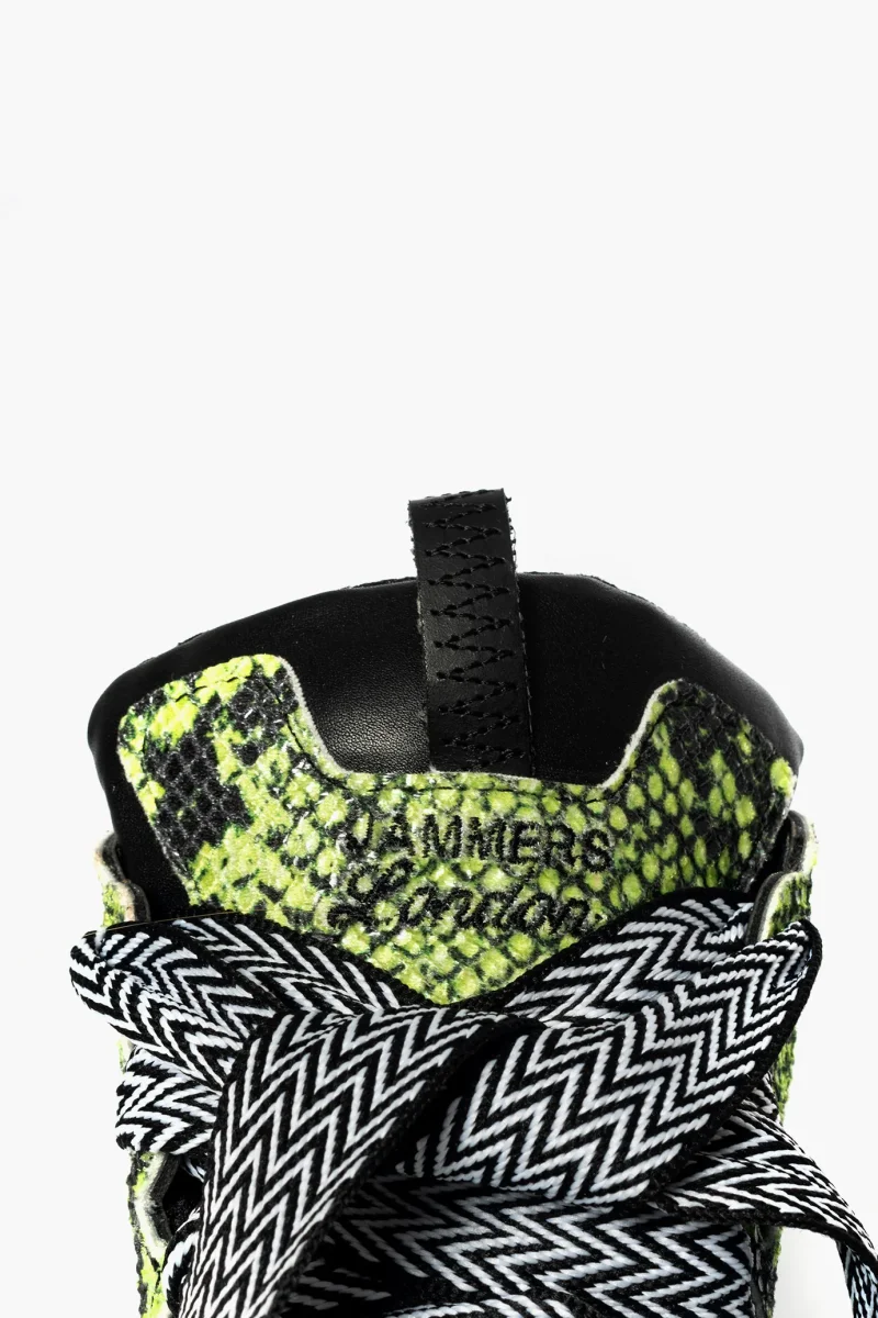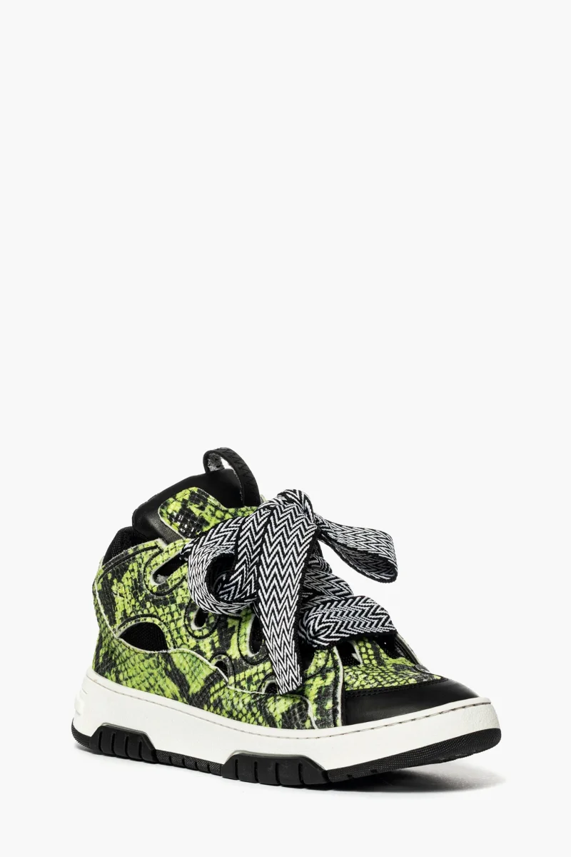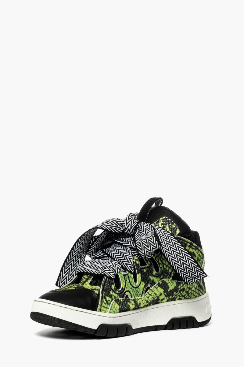 Sneakers Cambridge in similpelle anaconda verde e riporti in nero, interni in spugna, doppio laccio bianco sotto e laccio largo bicolore bianco nero, particolratà primaria, con ricami, suola in bianco e nero, altezza 4. Calzano regolari.
