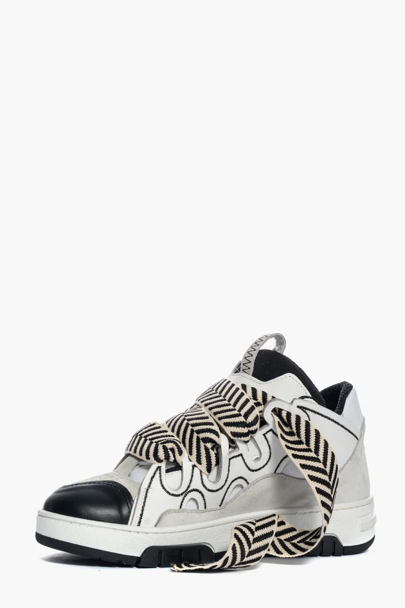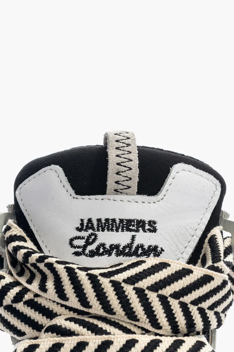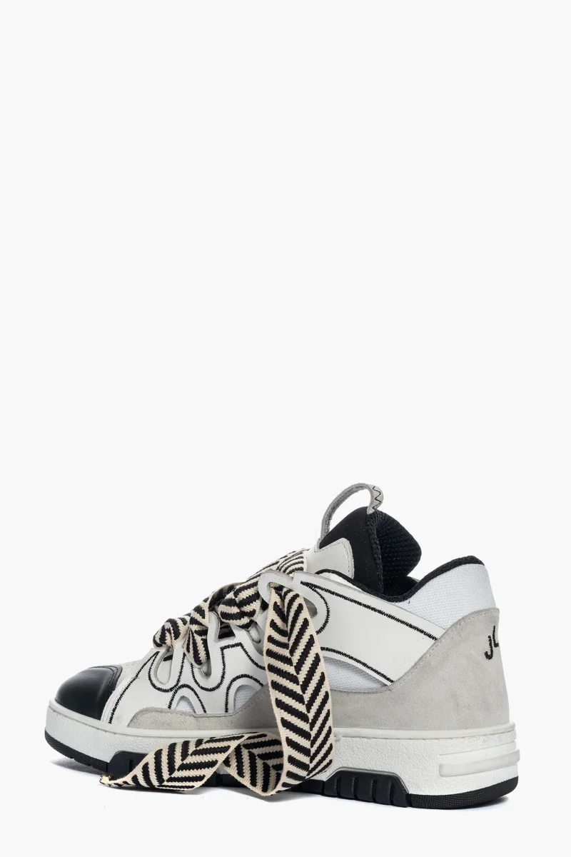 Sneakers Cambridge by Jammers London nella versione Black and White. Realizzate in pelle bianca e nera, camoscio ghiaccio e tessuto ape bianco. Suola in gomma bianca e battistrada nel colore nero. Dotate di lacci bianchi e doppio laccio largo in bianco e nero, particolare caratteristica di questo modello. Ricami che sottolineano il marchio Jammers London sia sulla linguetta e quindi sulla parte frontale, che ai lati con la sigla JL. Interno in spugna nel colore in tinta ed altezza suola 3 cm. Calzata regolare. Calzature realizzate artigianalmente, rigorosamente made in Italy.