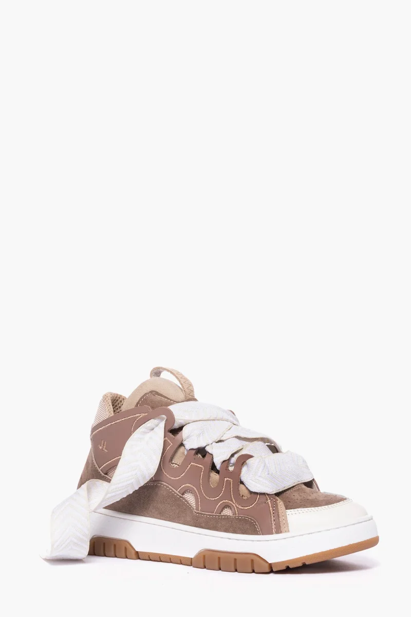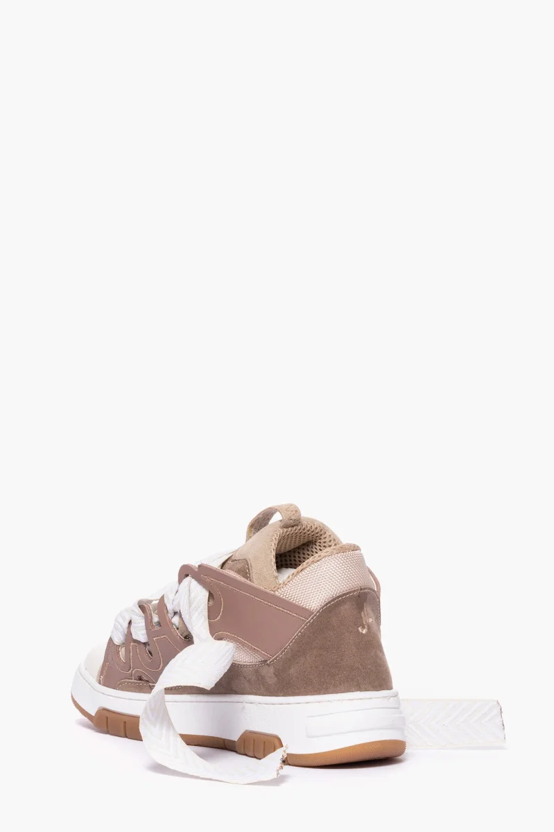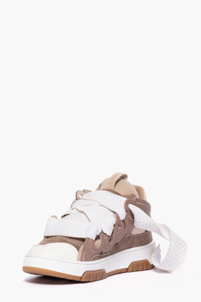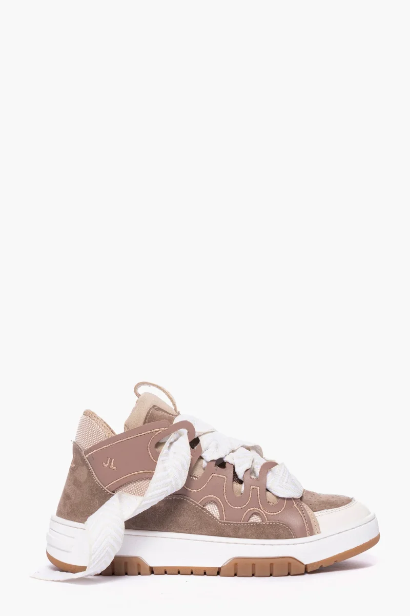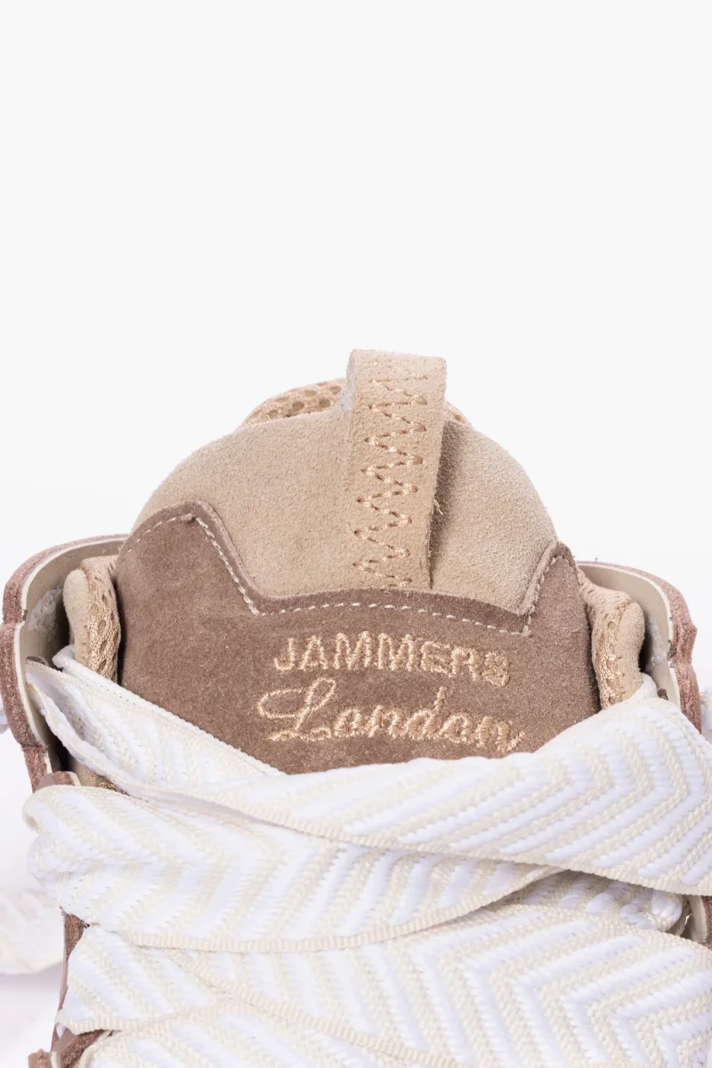 Sneakers Cambridge by Jammers London nella versione Safari. Realizzate in camoscio e pelle taupe, tessuto ape beige. Suola in gomma bianca e battistrada nel colore cammello. Dotate di lacci bianchi e doppio laccio largo in bianco e beige, particolare caratteristica di questo modello. Ricami che sottolineano il marchio Jammers London sia sulla linguetta e quindi sulla parte frontale, che ai lati con la sigla JL. Interno in spugna nel colore in tinta ed altezza suola 3 cm. Calzata regolare. Calzature realizzate artigianalmente, rigorosamente made in Italy.
