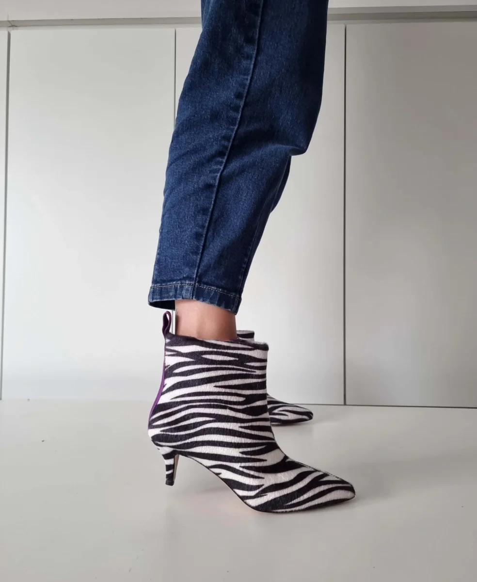 Stivaletti sopra alla caviglia in cavallino sintetico zebrato bianco e nero e riporto in camoscio viola, interni e sottopiede in similpelle. Tacco 6 cm, rivestito. Calzata regolare, punta stretta. Calzature realizzate in modo artigianale, rigorosamente Made in Italy.