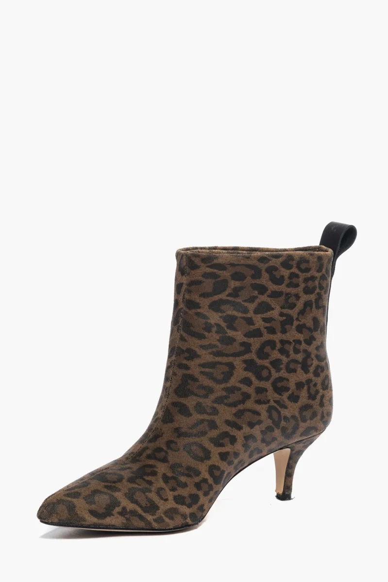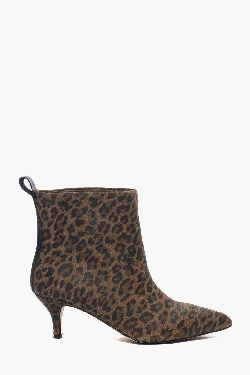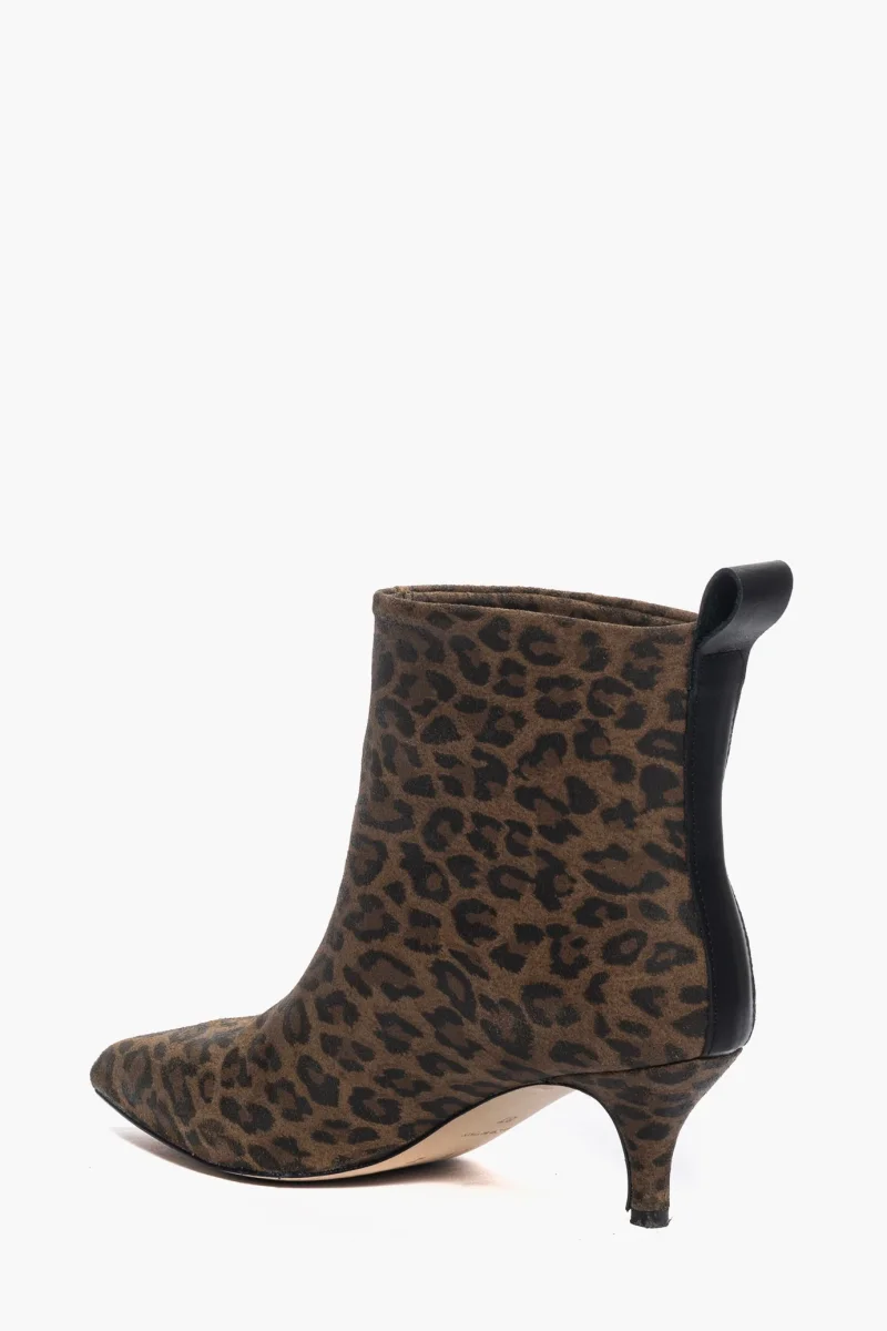 Stivaletti sopra alla caviglia in pelle animalier con riporto in pelle nero, tacco 6 rivestito, interni e sottopiede in similpelle, privo di cerniera. Calzano giusti, punta stretta. Calzature realizzate in modo artigianale, rigorosamente Made in Italy.
