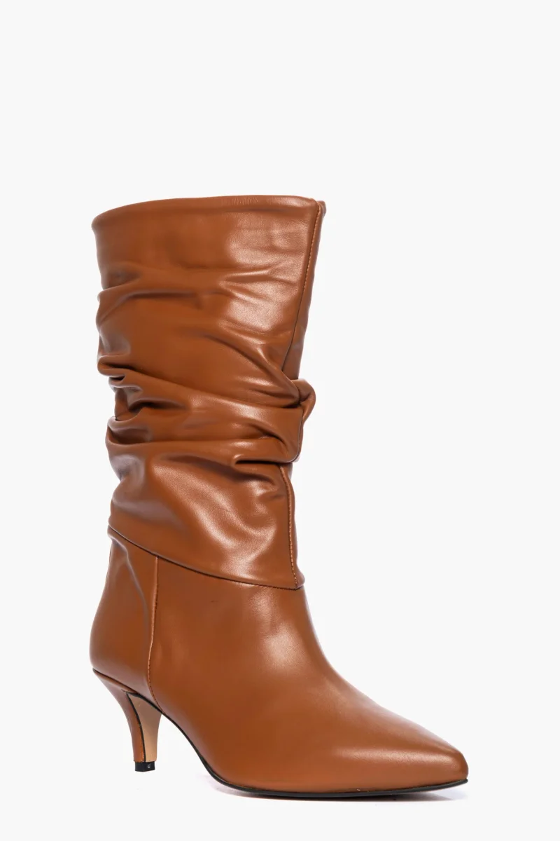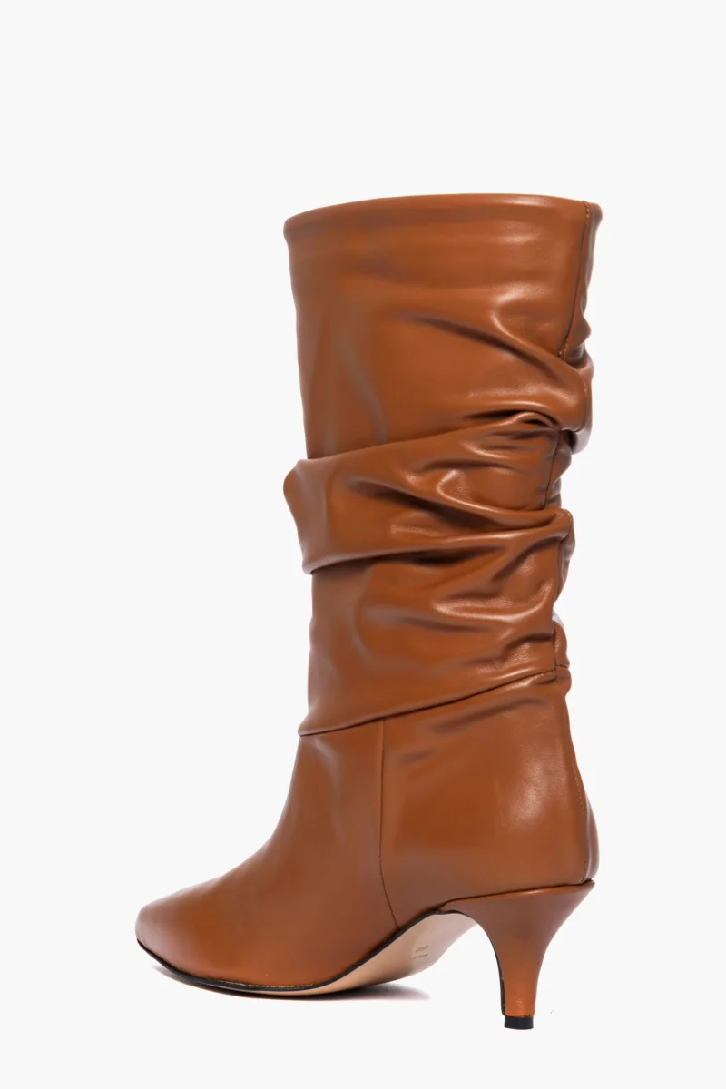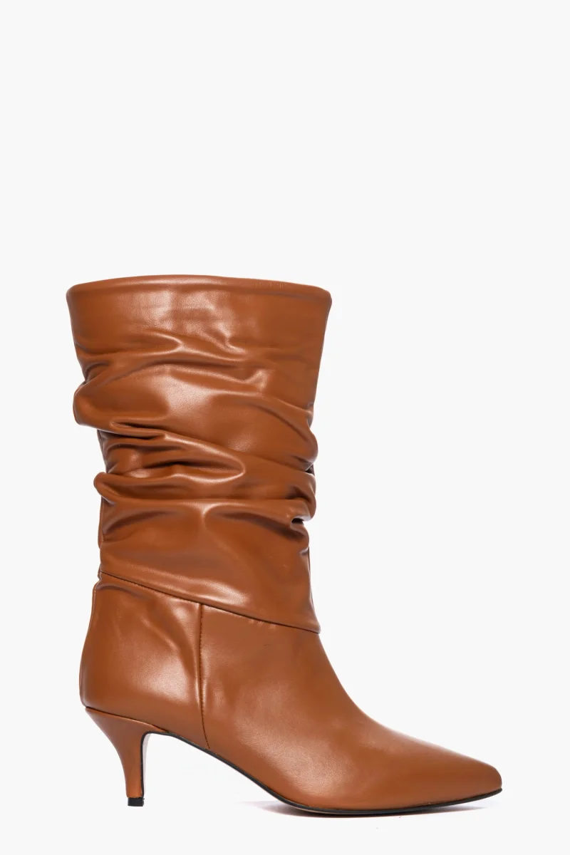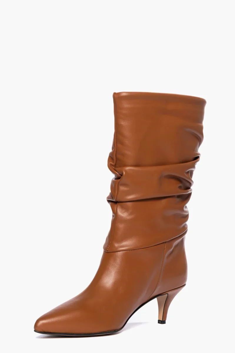 Stivali in pelle cuoio, aggrappato, tacco rivestito in pelle cuoio, altezza 5 cm, interni e sottopiede in similpelle, privo di cerniera. Calzano regolari, punta leggermente stretta in avanti. Calzature realizzate in modo artigianale, rigorosamente Made in Italy.