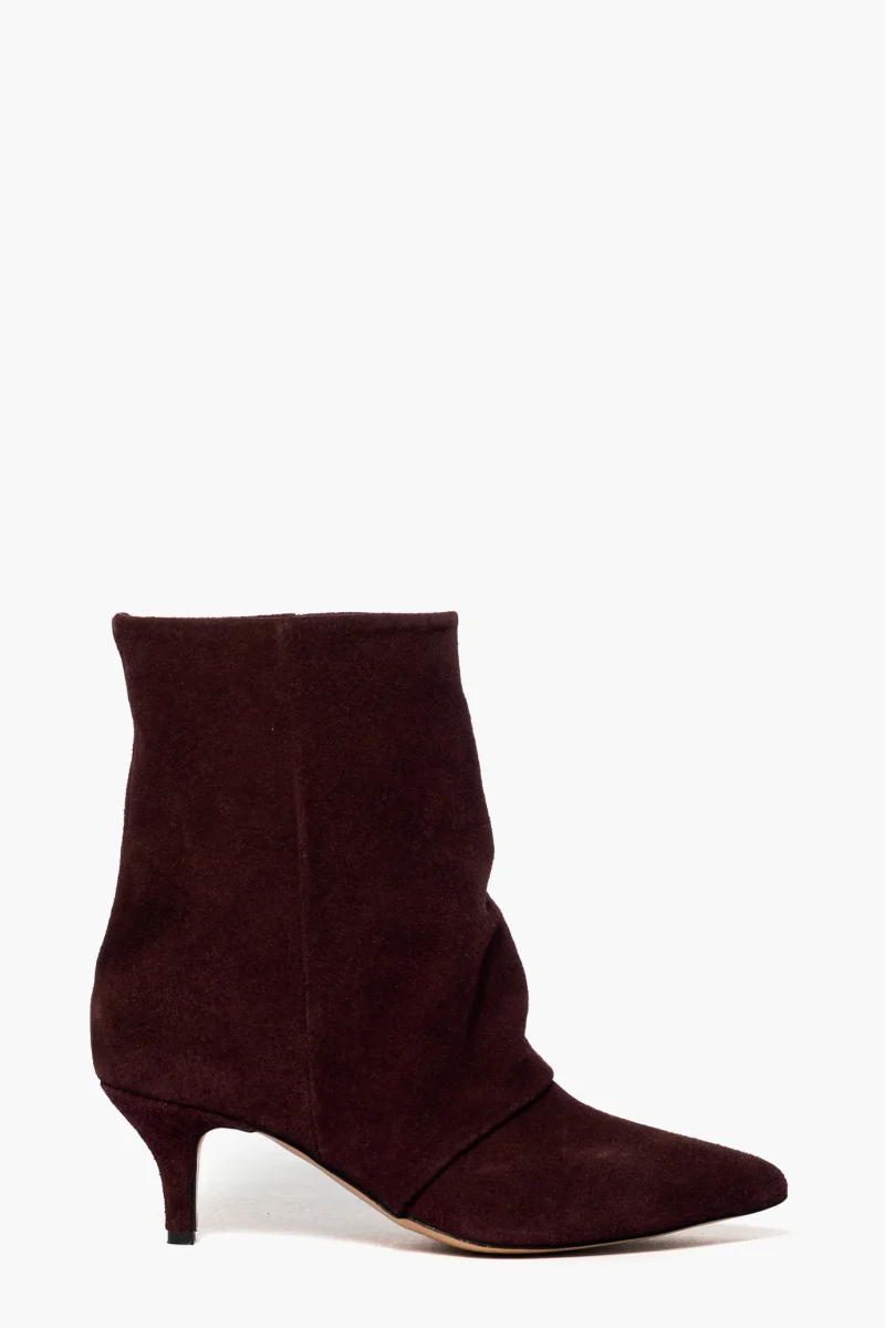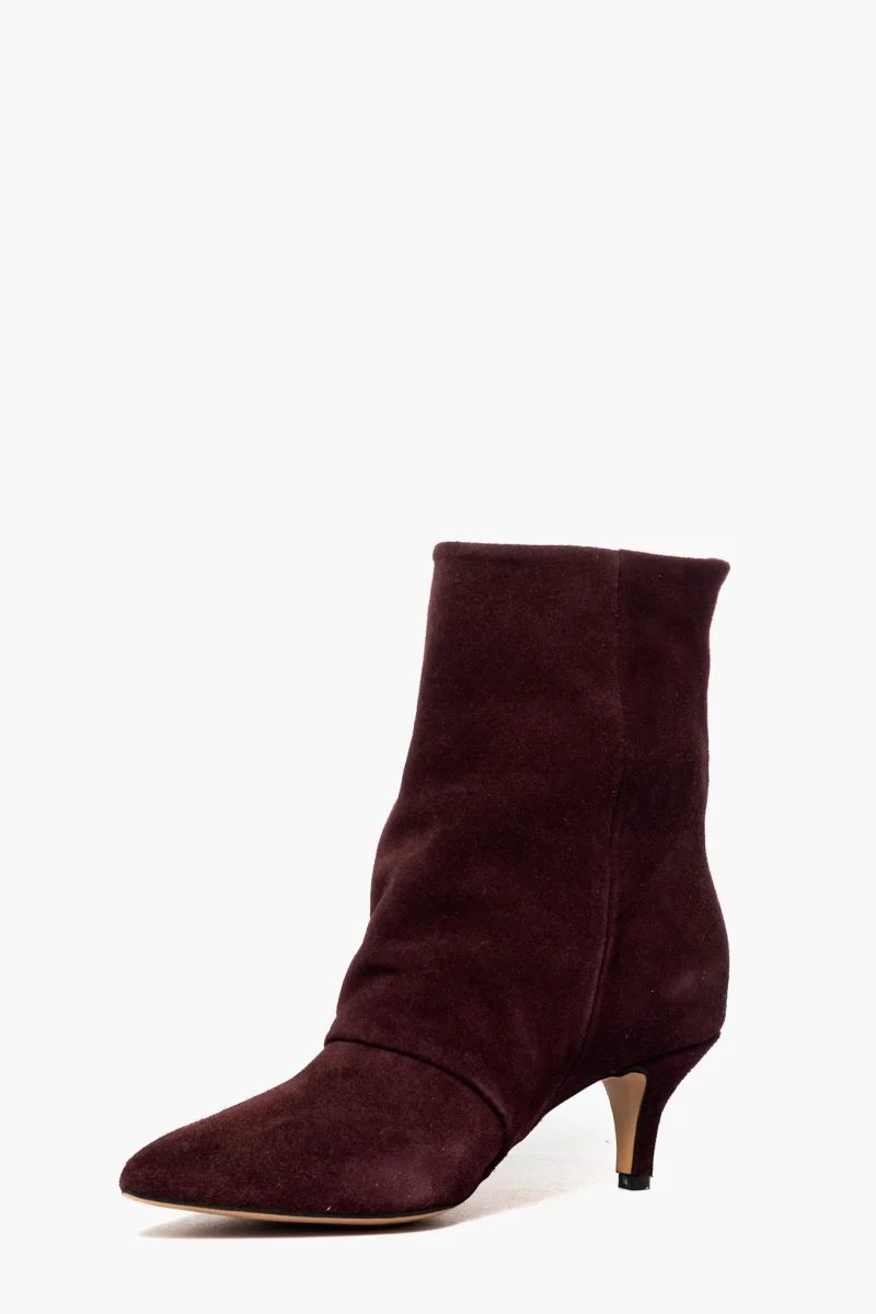 Stivaletti in camoscio vinaccia alti alla caviglia, aggrappato in avanti. Tacco rivestito altezza 6 cm, punta stretta, interni e sottopiede in similpelle. Calzata regolare, privo di cerniera. Calzature realizzate artigianalmente, rigorosamente Made in Italy.