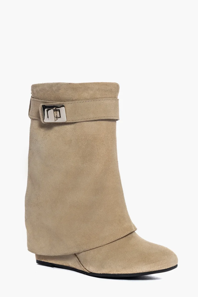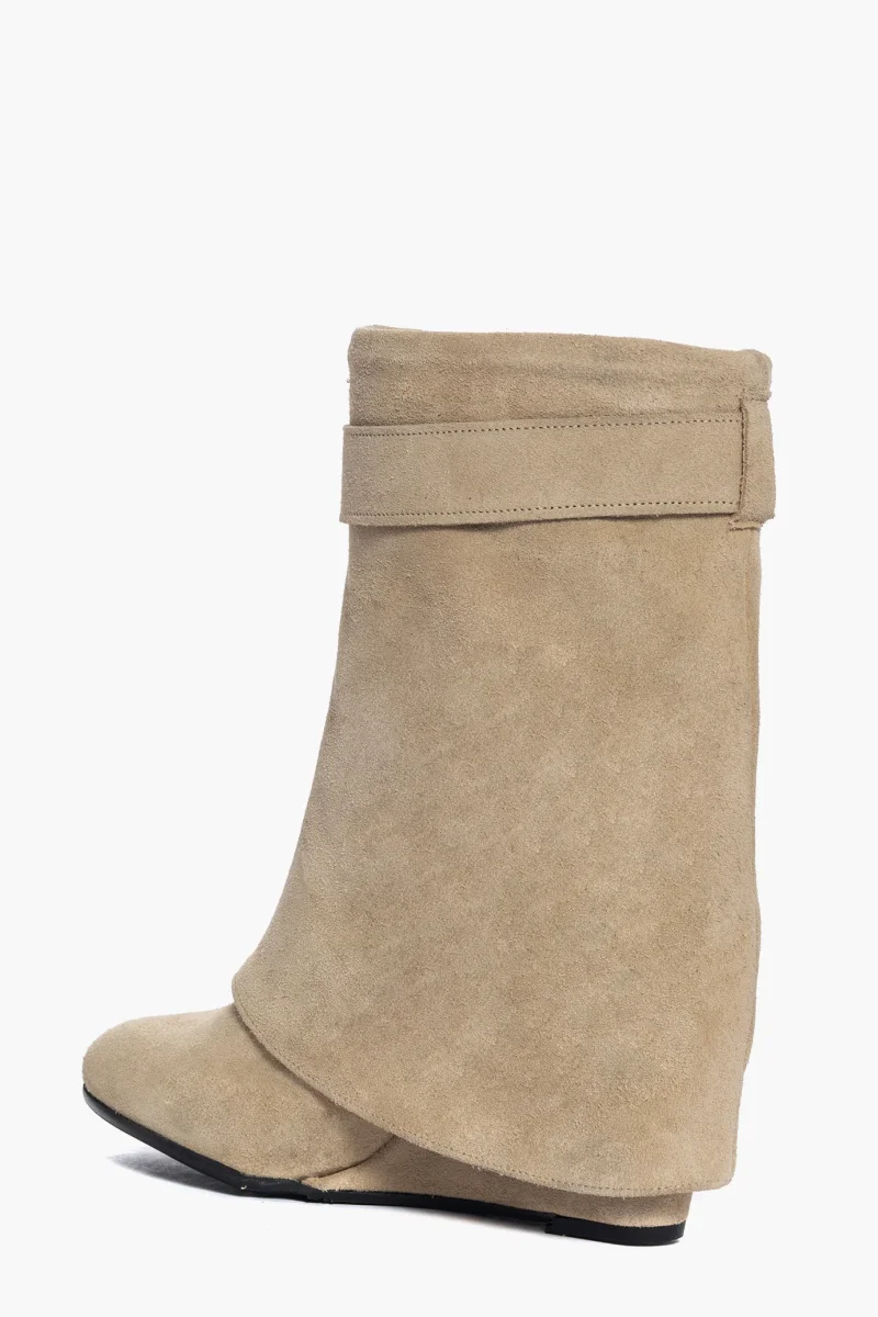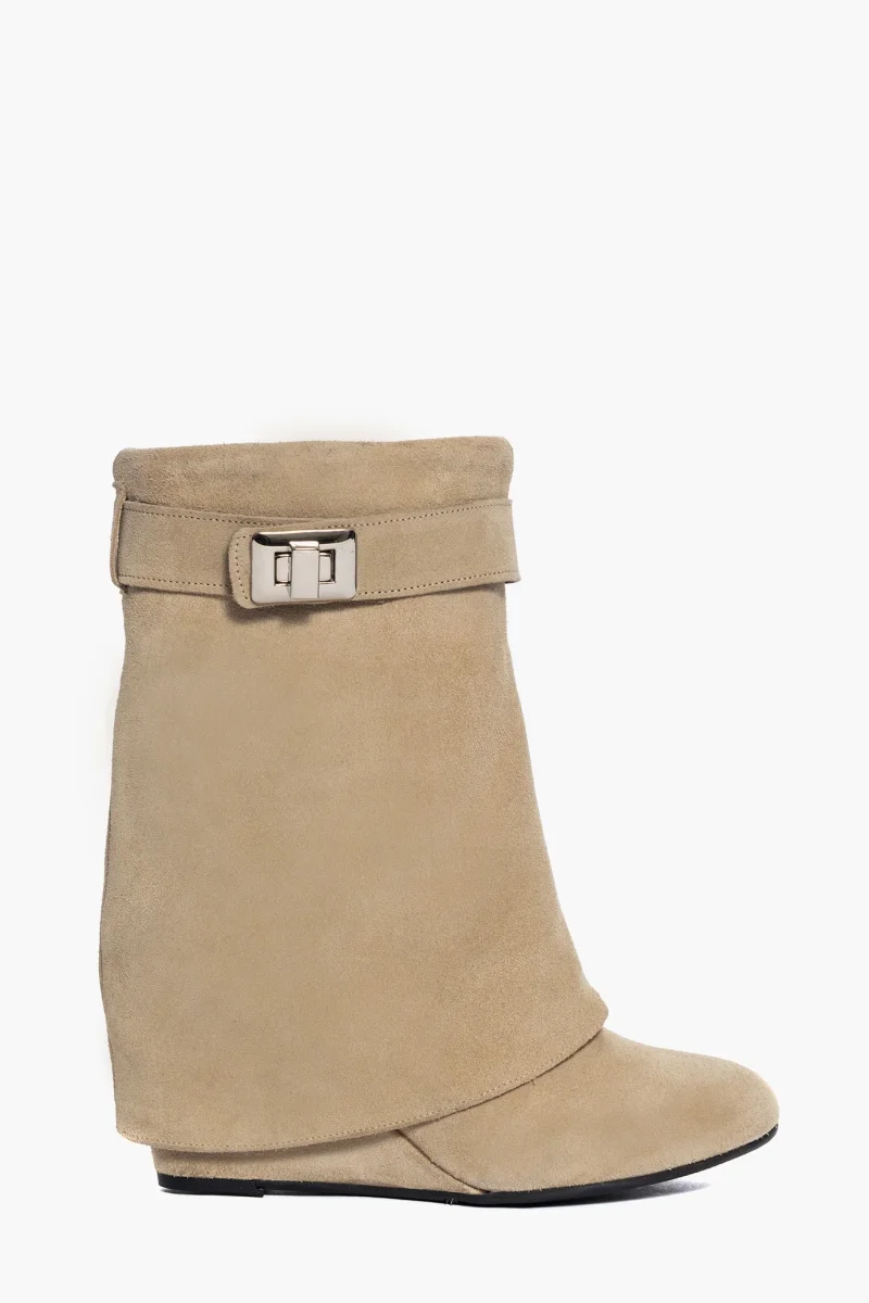 Stivaletti in camoscio beige, con risvolto e zeppa rivestita in camoscio beige, altezza 7/8 cm. Interni e sottopiede in similpelle, cintura con accessori in colore argento. Stivaletti a metà polpaccio. Calzata regolare. Calzature realizzate artigianalmente, rigorosamente made in Italy.