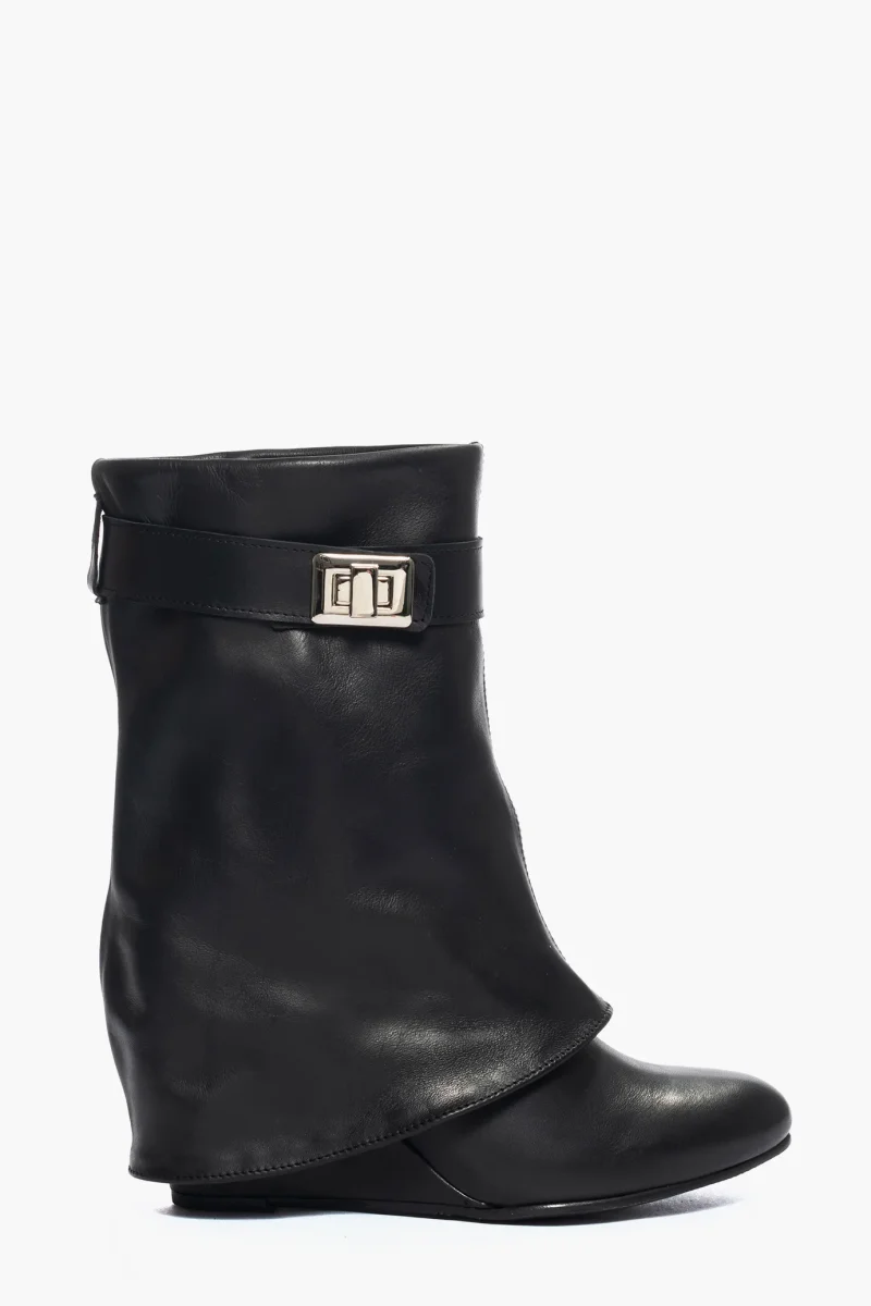 Stivaletti in pelle nero, con risvolto e zeppa rivestita in pelle nero, altezza 7/8 cm, interni e sottopiede in similpelle, cintura con accessori in colore argento, stivaletti a metà polpaccio, privo di cerniera, calzano regolari. Calzature realizzate in modo artigianale, rigorosamente made in Italy.