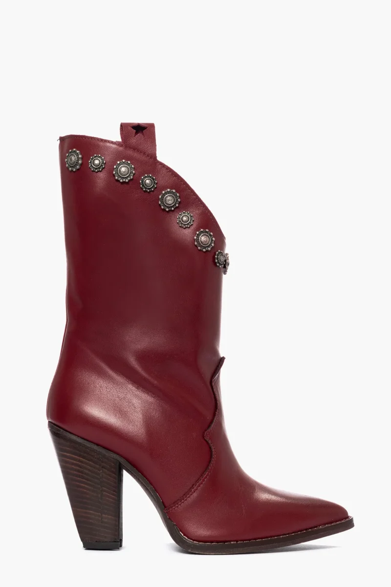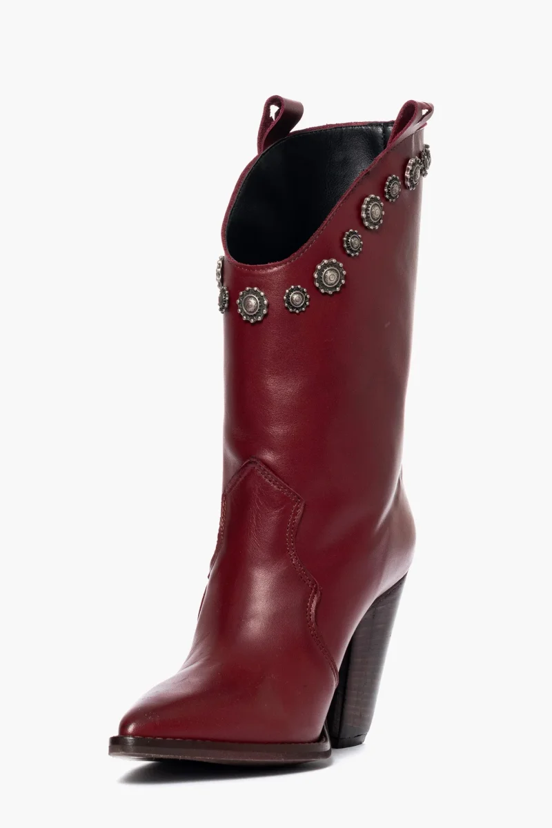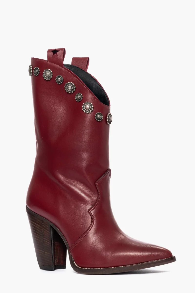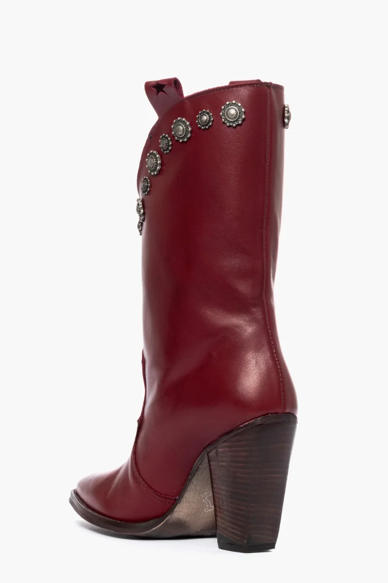 Stivali in pelle bordeaux al polpaccio, con borchie dalla forma particolare colore antracite, privo di cerniera, forma texana, altezza 9 tacco nero. Calzano regolari, punta leggermente stretta in avanti, interni e sottopiede in similpelle. Calzature realizzate in modo artigianale, rigorosamente Made in Italy.