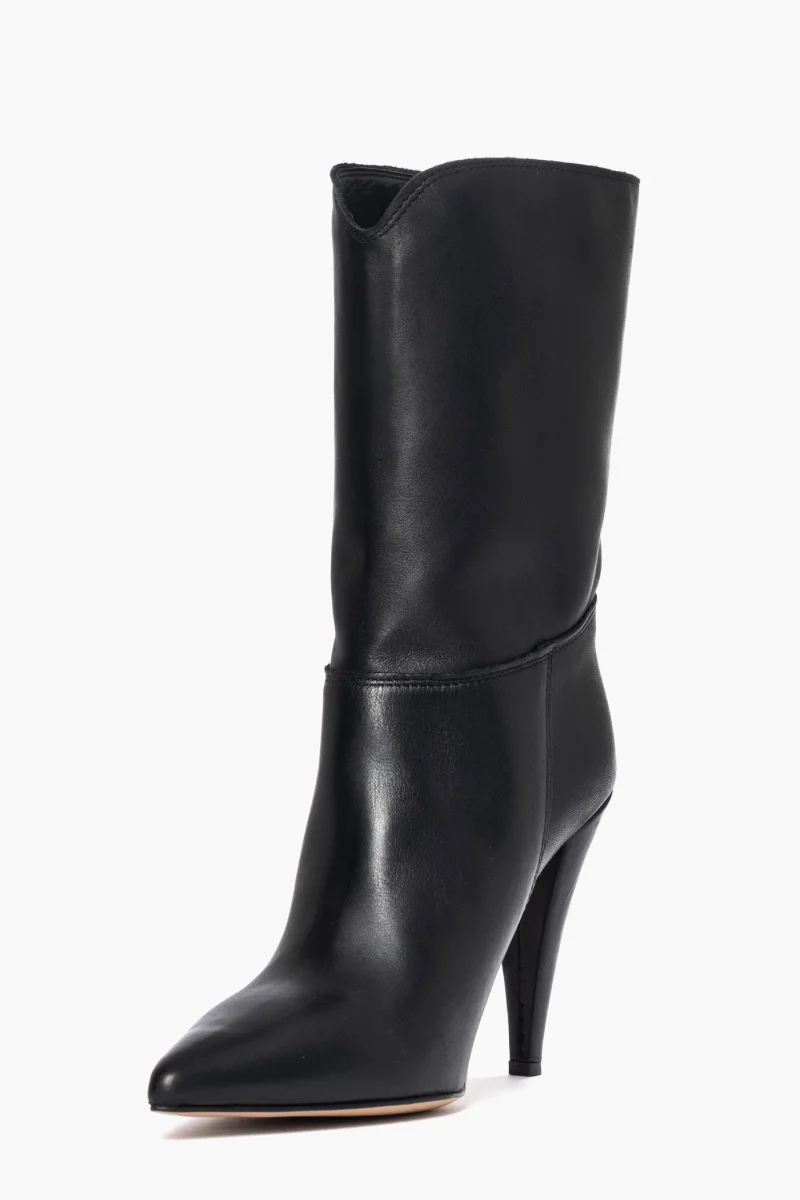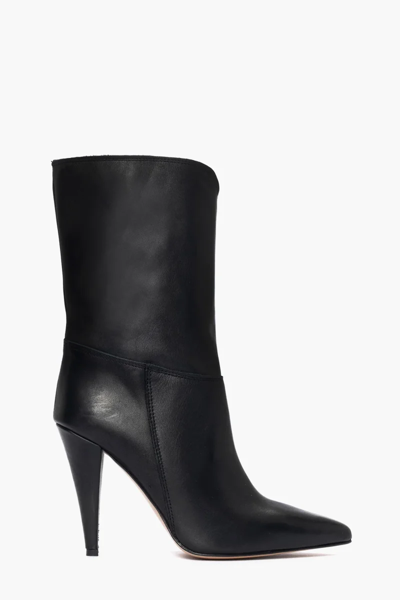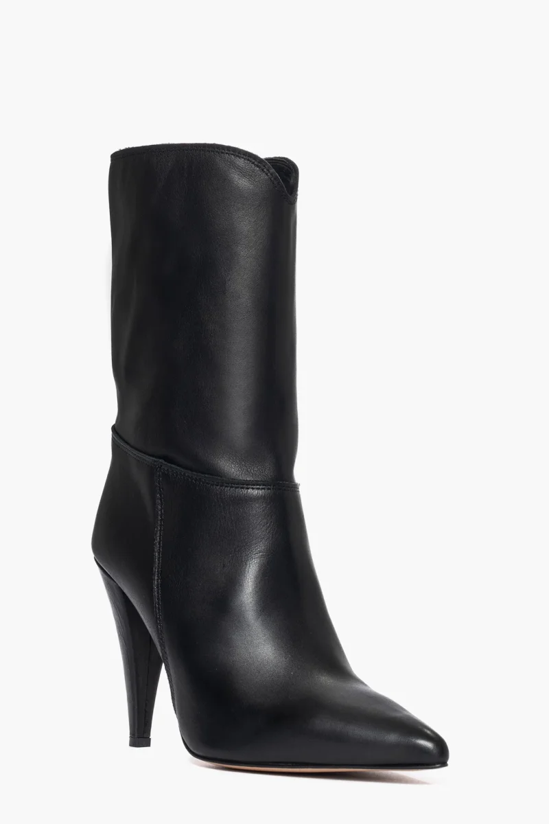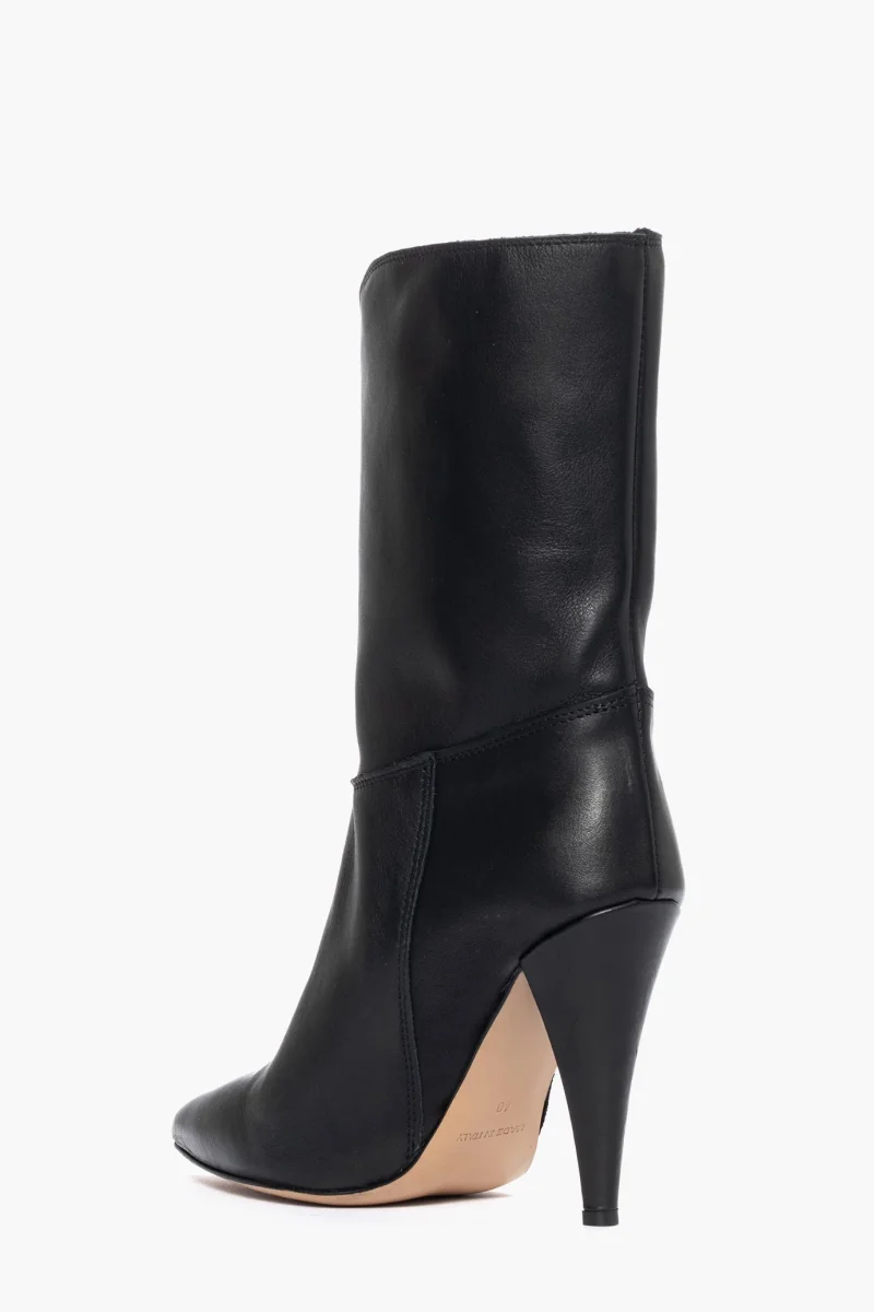 Stivaletti in pelle nero al polpaccio in pelle nero, tacco rivestito, altezza 10, interni in similpelle, calzano regolari, punta in avanti leggermente stretta. Calzature artigianali, made in Italy.