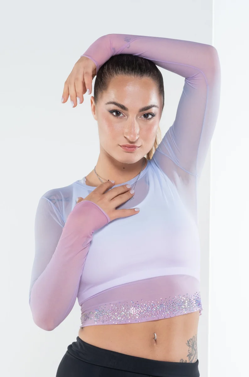 T-shirt manica lunga in tessuto mesh (Tulle) sfumato, trasparente, bielastico antibatterico.