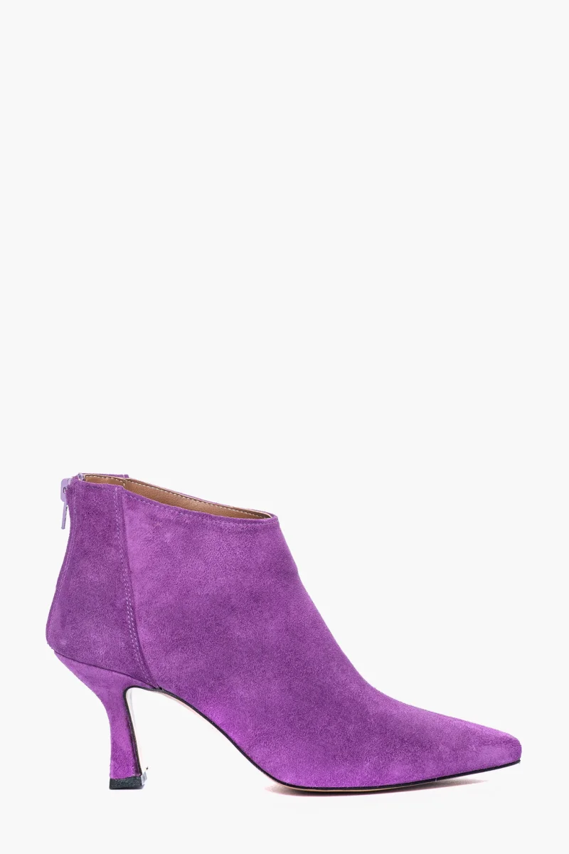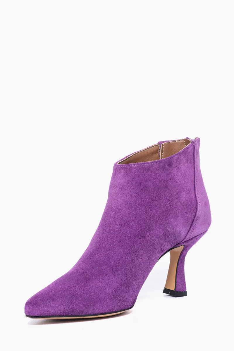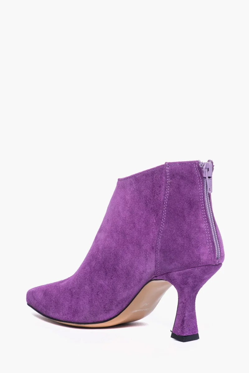 Tronchetti in camoscio viola con zip, interni e sottopiede in similpelle, tacco rivestito in camoscio, altezza 8 cm. Calzata regolare, punta leggermente stretta in avanti. Calzature realizzate in modo artigianale, rigorosamente Made in Italy.