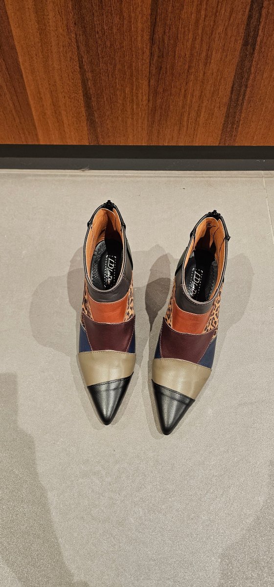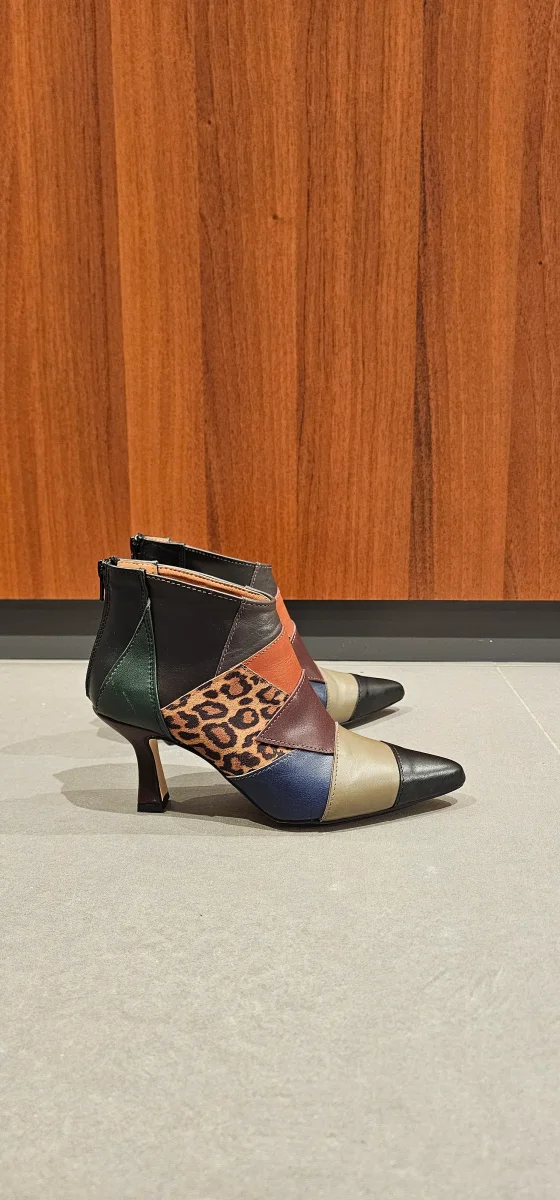 Tronchetti in pelle con patch di colori diversi, nella prima versione, Animalier, ci sono tutti i colori caldi per creare outfit di vario genere, cerniera al tallone, interni in similpelle, tacco rivestito, 8.5. Calzano regolari, punta leggermente stretta, calzature artigianali, made in Italy.