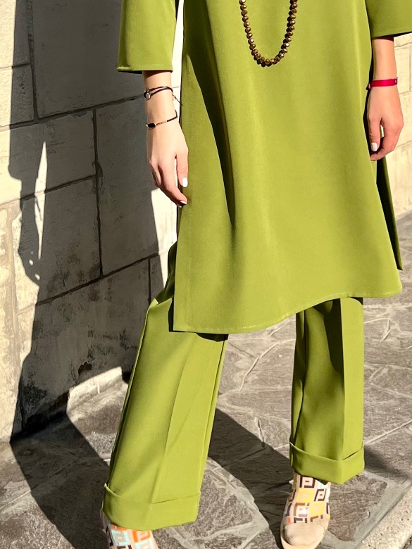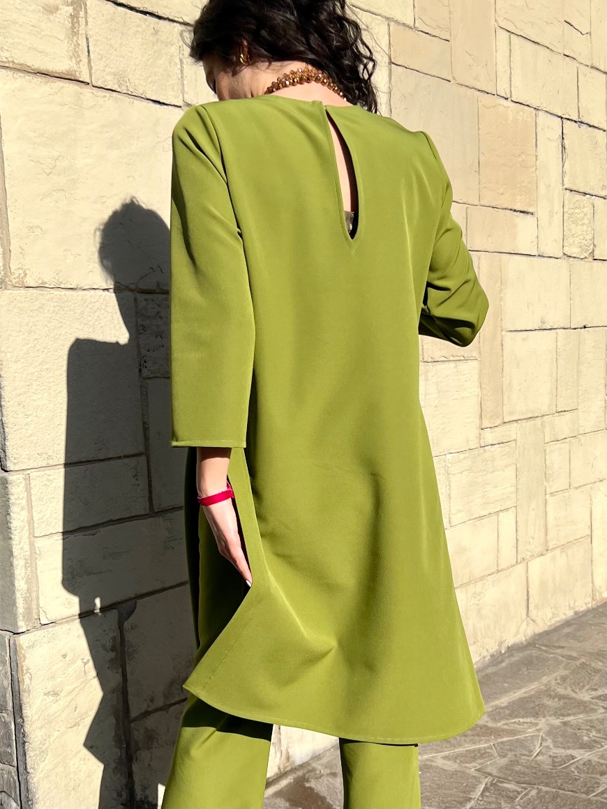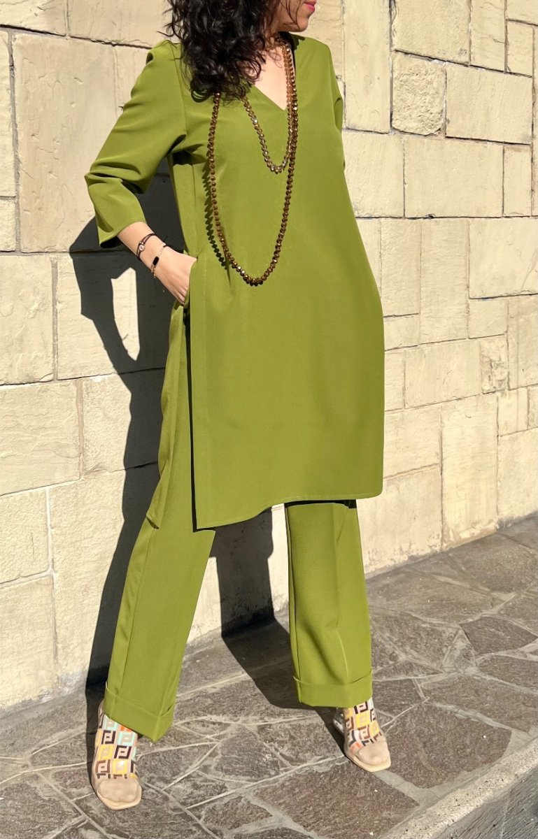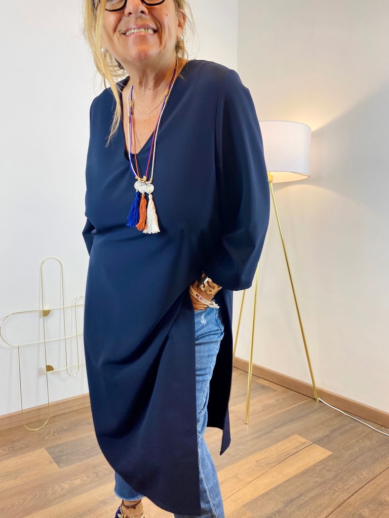Tunica con scollo a V, in viscosa. È un nostro modello originale e interamente prodotto a mano dal nostro laboratorio . Si può realizzare massimo fino ad una 48/50. È possibile applicare, con un sovrapprezzo di 5€, un bordino in contrasto sia nello scollo che nei polsi.