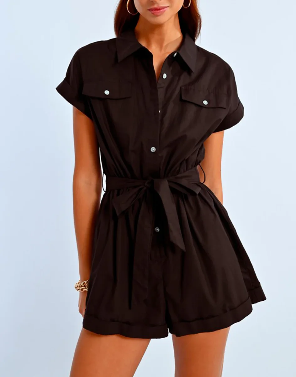 Tuta stile camicia con maniche corte e polsini, colletto a blusa e tasche con patta sul petto. Chiusura con bottoni sulla parte anteriore e cintura larga da annodare in vita. Polsini sul fondo dei pantaloncini completano il look casual e chic.