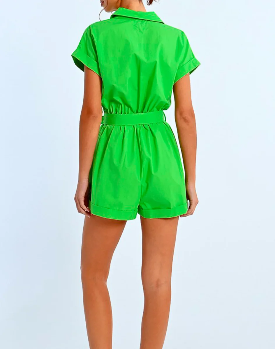 Tuta in stile camicia con maniche corte e polsini, colletto a blusa e tasche con patta sul petto. Chiusura frontale con bottoni e cintura larga da annodare in vita. Polsini sui pantaloncini per un dettaglio chic e casual.