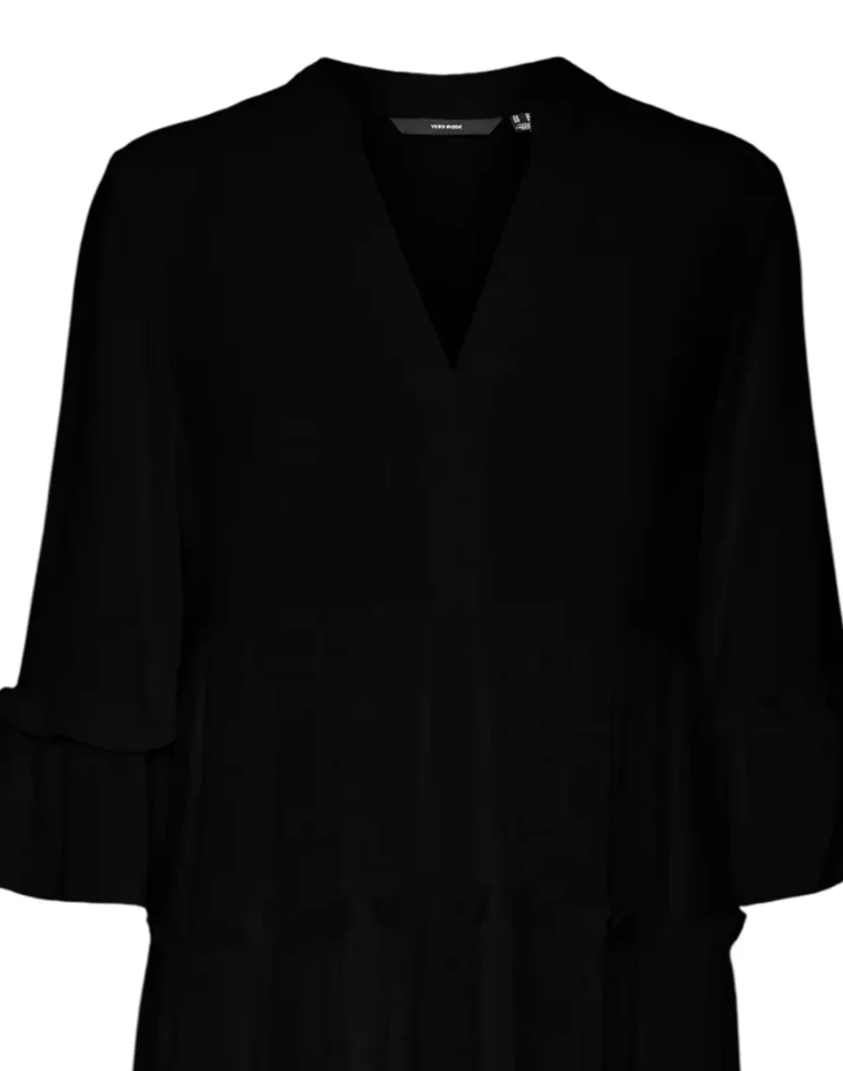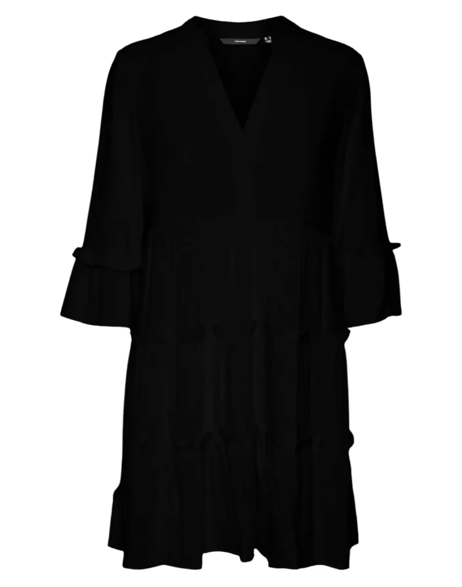 Vestito corto con scollo a V e maniche 3/4 ampie, arricchito da dettagli con volant che ne esaltano la femminilità. La vestibilità regular fit assicura comfort e praticità, ideale per un look elegante e leggero.