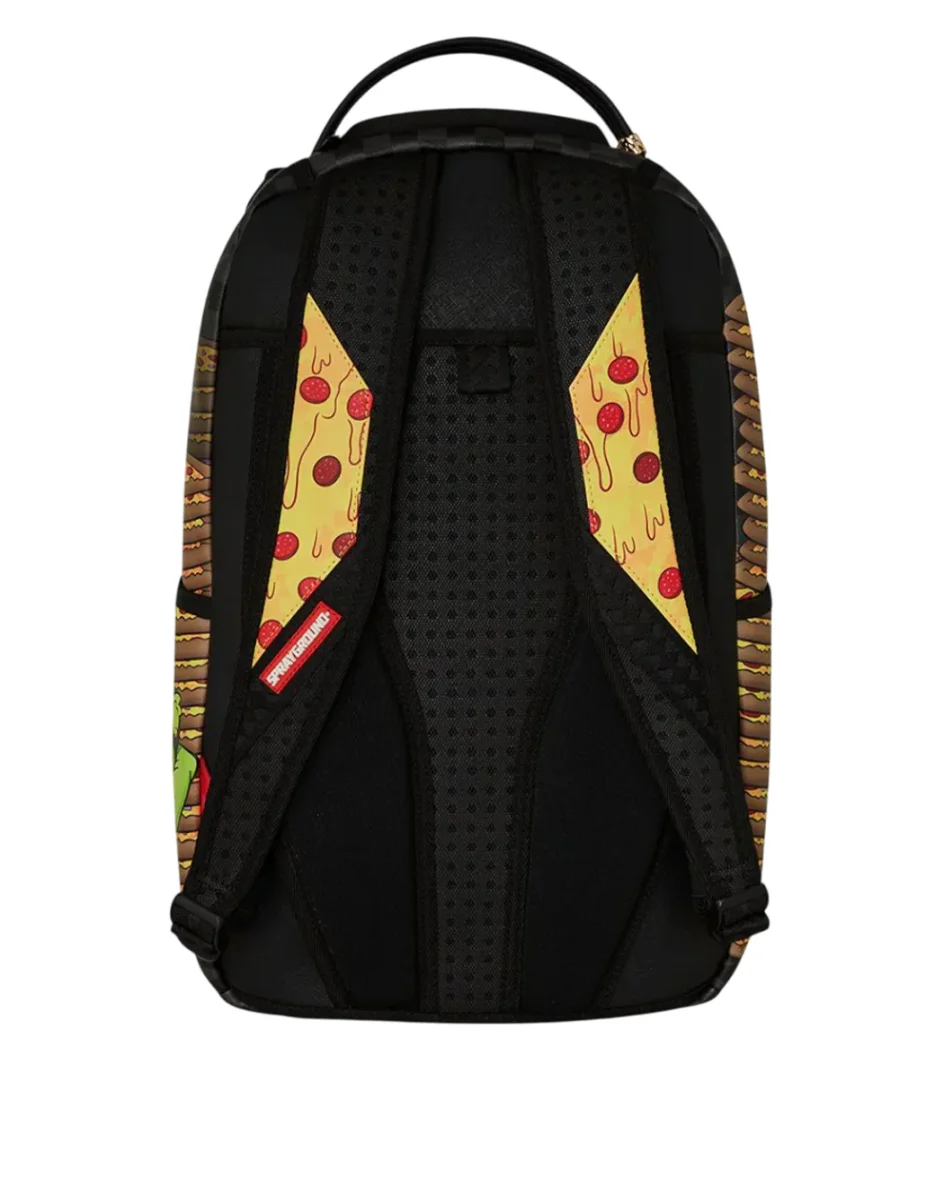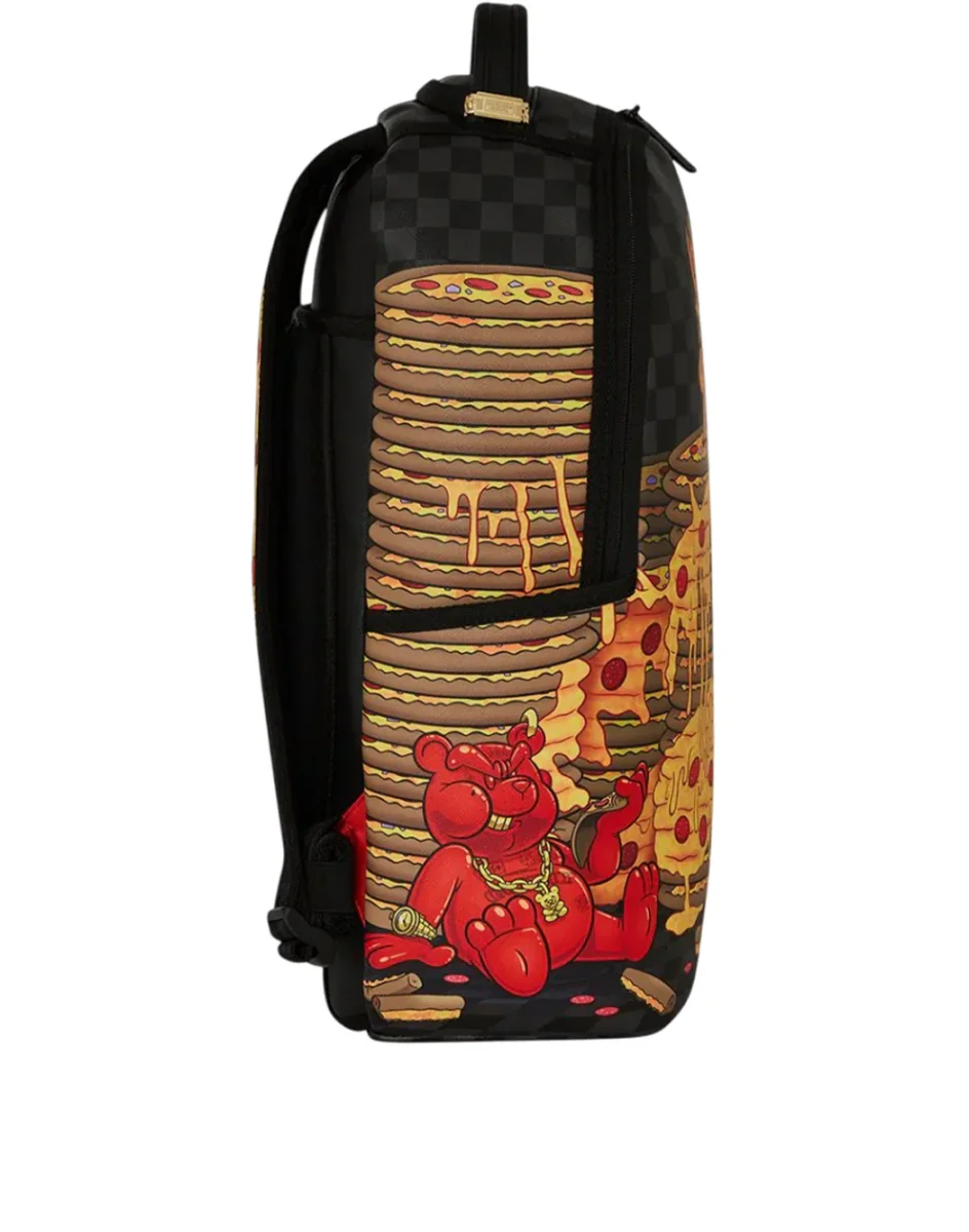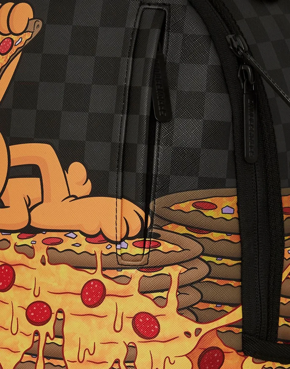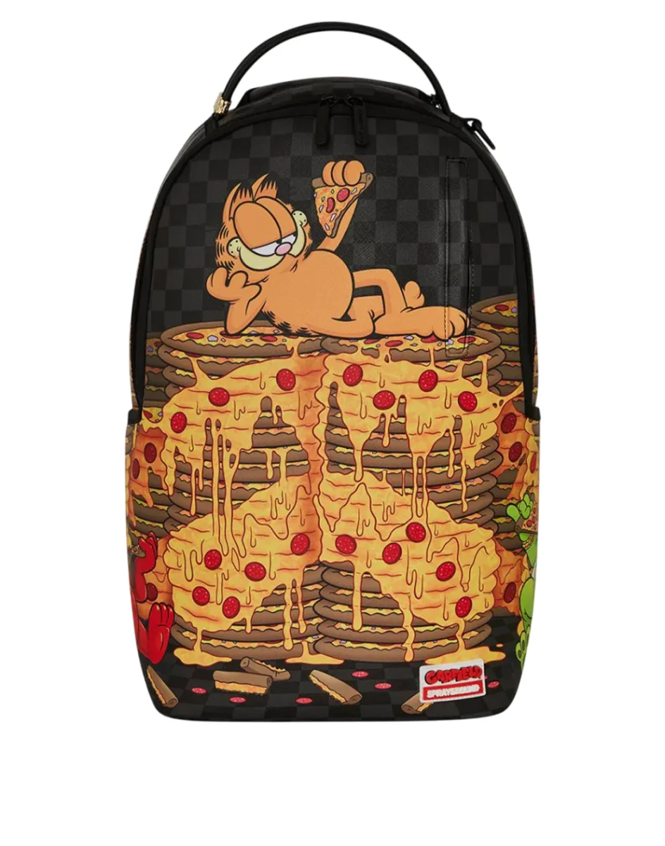 Zaino Sprayground “Garfield and Money Bear” in ecopelle resistente con grafica vivace, tasche multiple, scomparto laptop, spallacci regolabili e passante trolley.
