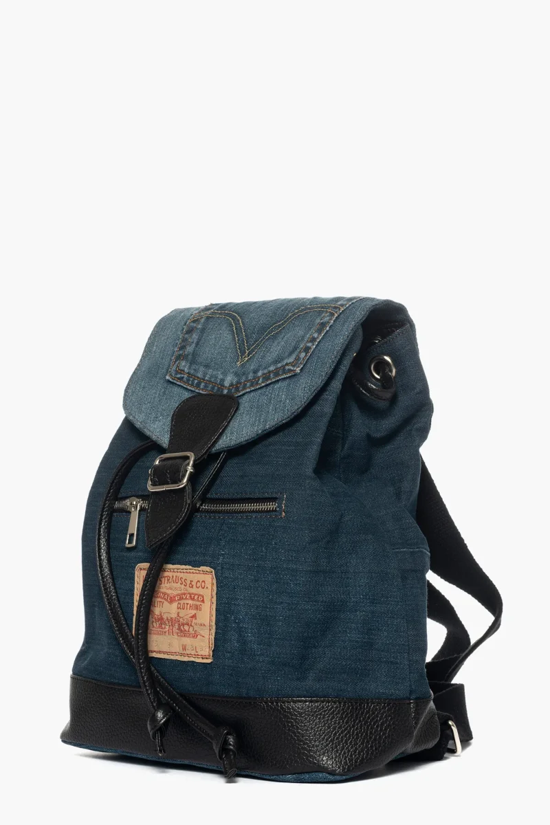 Zaino in jeans e riporto in similpelle nero, interni foderari. NOTA BENE, LA COLORAZIONE DEL JEANS POTREBBE CAMBIARE, IN QUANTO VENGONO UTILIZZATI DEI VERI E PROPRI JEANS, PER CUI VARIANO CONTINUAMENTE LE TONALITà, A SOTTOLINEARE L’ARTIGIANALITà DEL PRODOTTO.