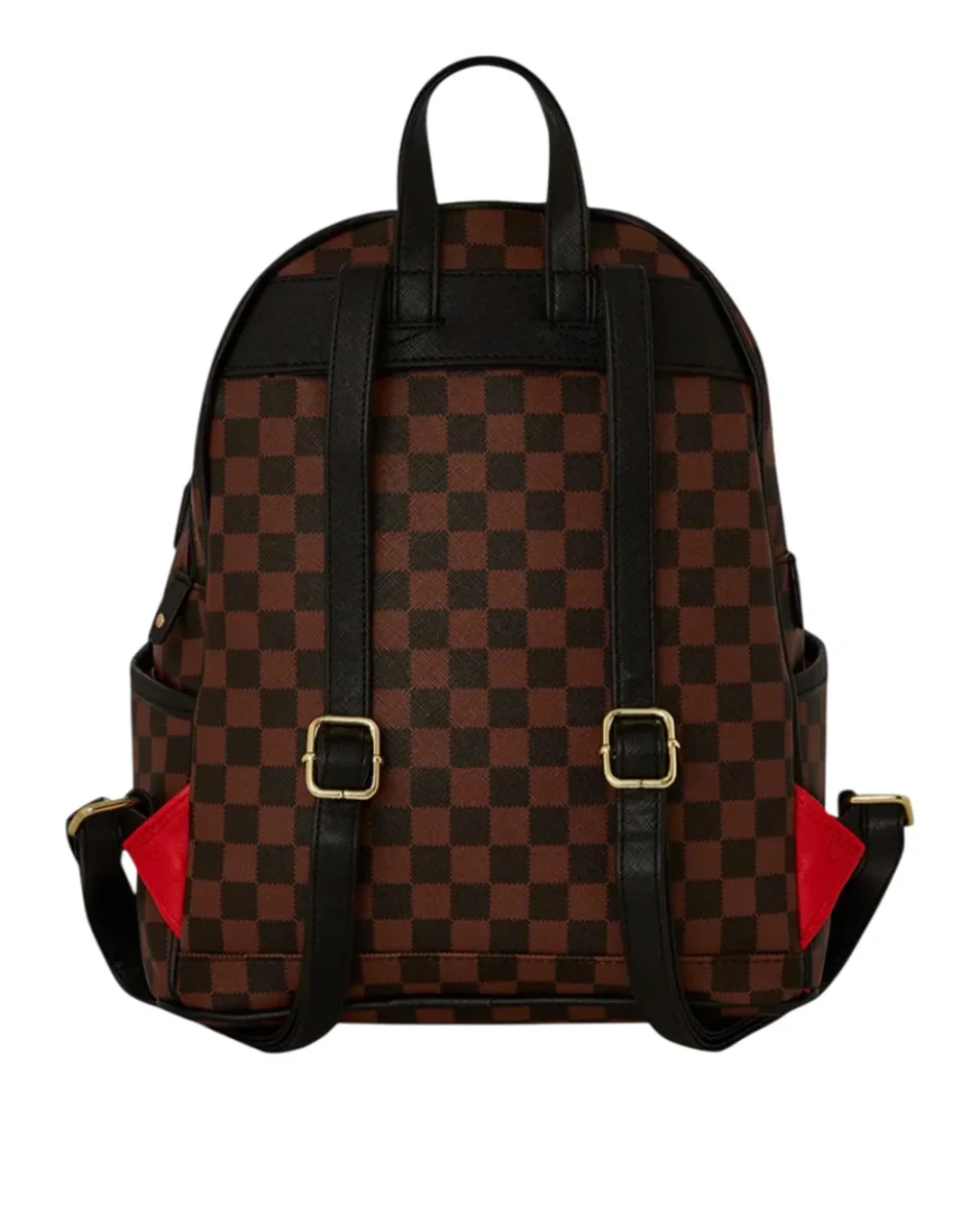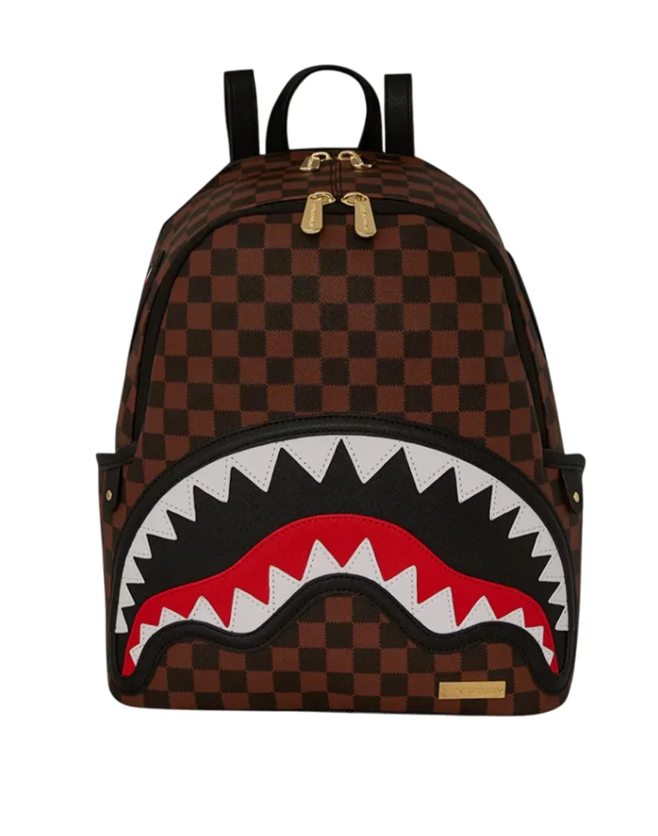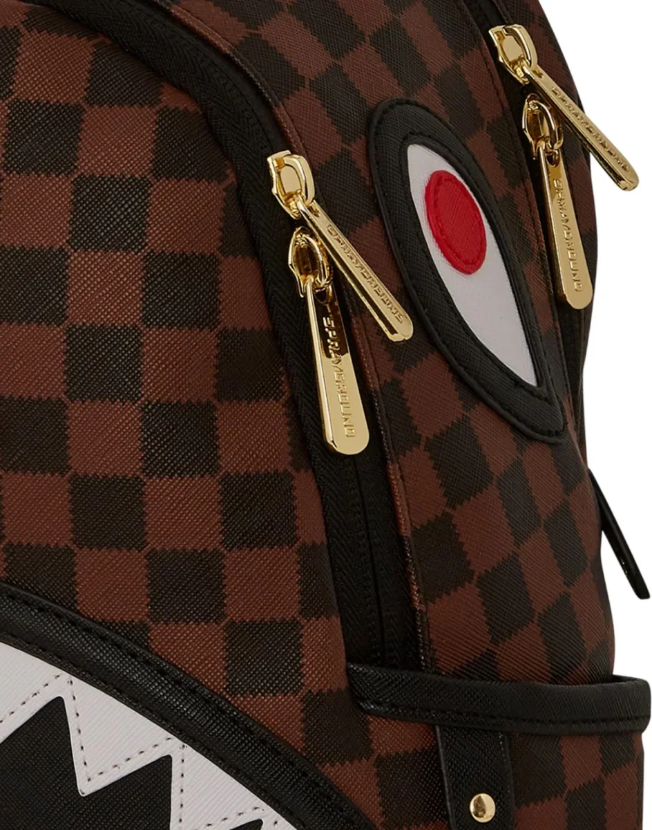 Zaino Sprayground “Sawtooth Sharks in Paris” in ecopelle waterproof con stampa check e bocca shark a denti seghettati. Tasche multiple, scomparto laptop, spallacci regolabili e passante trolley.
